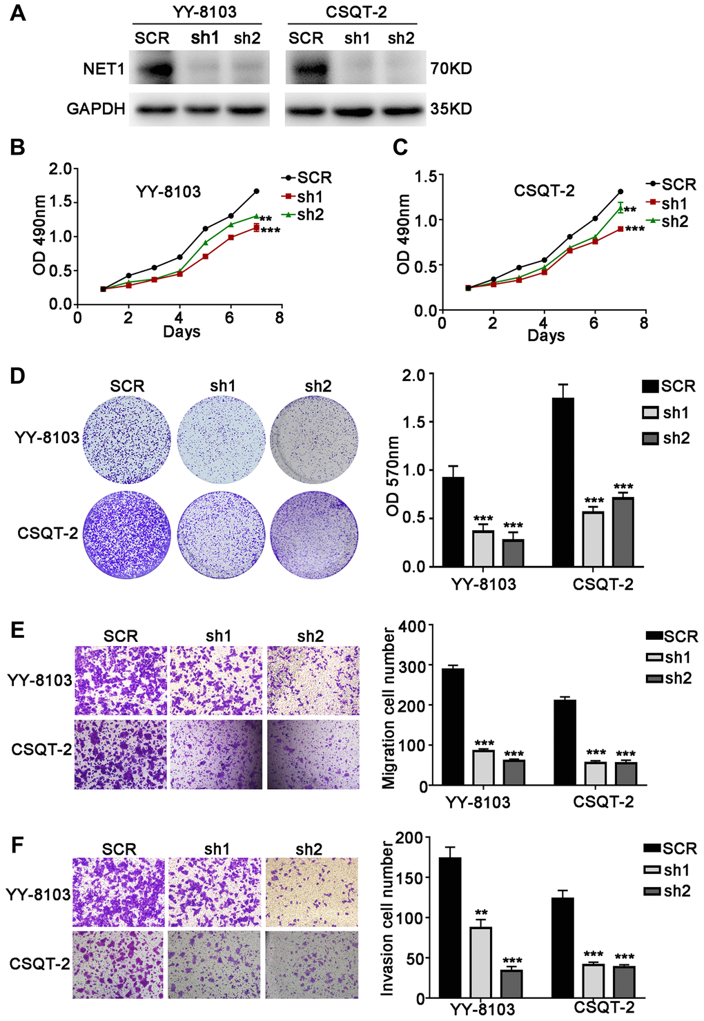 To further confirm the functions of NET1, its expression levels were knocked down by 2 independent shRNAs in YY-8103 and CSQT-2 cells with relatively high NET1 expression (Figure 3A). Based on MTT (Figure 3B, 3C) and crystal violet assays (Figure 3D), we observed that NET1 knockdown inhibited the proliferation and colony formation of YY-8103 and CSQT-2 cells. Moreover, transwell assay demonstrated that NET1 downregulation markedly suppressed the invasion and migration capabilities of the two cells (Figure 3E, 3F). Altogether, these findings indicated that downregulation of NET1 expression may exert a protective effect by suppressing the proliferation, migration and invasion of HCC cell lines.