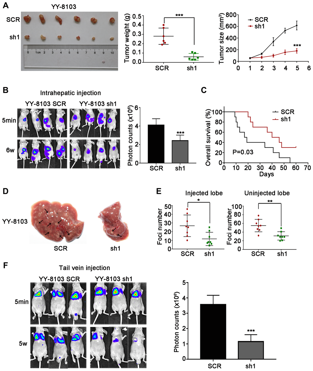 For intrahepatic metastasis assays, the cells labeled with luciferase (5 × 105 cells/mouse) were infused into the left liver of nude mice. For lung metastasis assays, cells (1 × 106 cells/mouse) were infused into the tail veins of nude mice. Metastatic lesions were monitored weekly based on luciferase expression levels. Mice were intraperitoneally infused with aqueous solutions of D-luciferin before being anaesthetized by isoflurane and imaged with an IVIS imaging system (Xenogen). Six or eight weeks later, mice were euthanized, and their livers were photographed and the foci numbers were counted. For survival assays, cells (5 × 105 cells/mouse) were infused into the left liver of nude mice, which were then raised under standard conditions until death. The time to death in mice was recorded within 60 days.