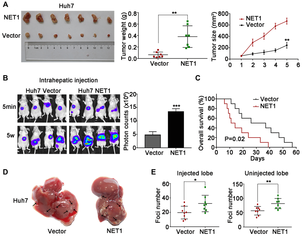Next, we established intrahepatic metastasis assays by injecting luciferase-labelled NET1 knockdown and normal YY-8103 cells into the left lobe of each nude mouse (n = 8 per group). As demonstrated in Figure 4B, the luciferase signals of the mouse liver in NET1 silencing group were markedly reduced compared to normal group. Also, less tumor foci was detected in the infused/non-infused lobes of NET1 silencing mice compared to normal mice (Figure 4D, 4E). On the contrary, NET overexpression in Huh7 cells remarkably promoted intrahepatic metastasis in the same model (Figure 5B–5E).