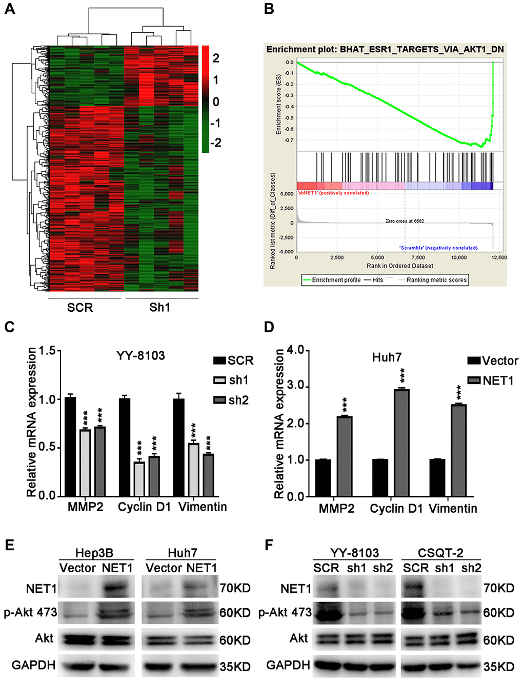 To identify the underlying molecular mechanism of NET1-induced effects in HCC, RNA-seq was performed using YY-8103 control cells and NET1 knockdown pool. A Hierarchical clustering generated from the expression profiles of differentially expressed mRNA from NET1-knocked down YY-8103 cells and control cells showed distinct mRNA expression patterns between the two groups (Figure 6A). In addition, the expression of Akt signaling-associated genes was also downregulated according to GSEA analysis (Figure 6B).