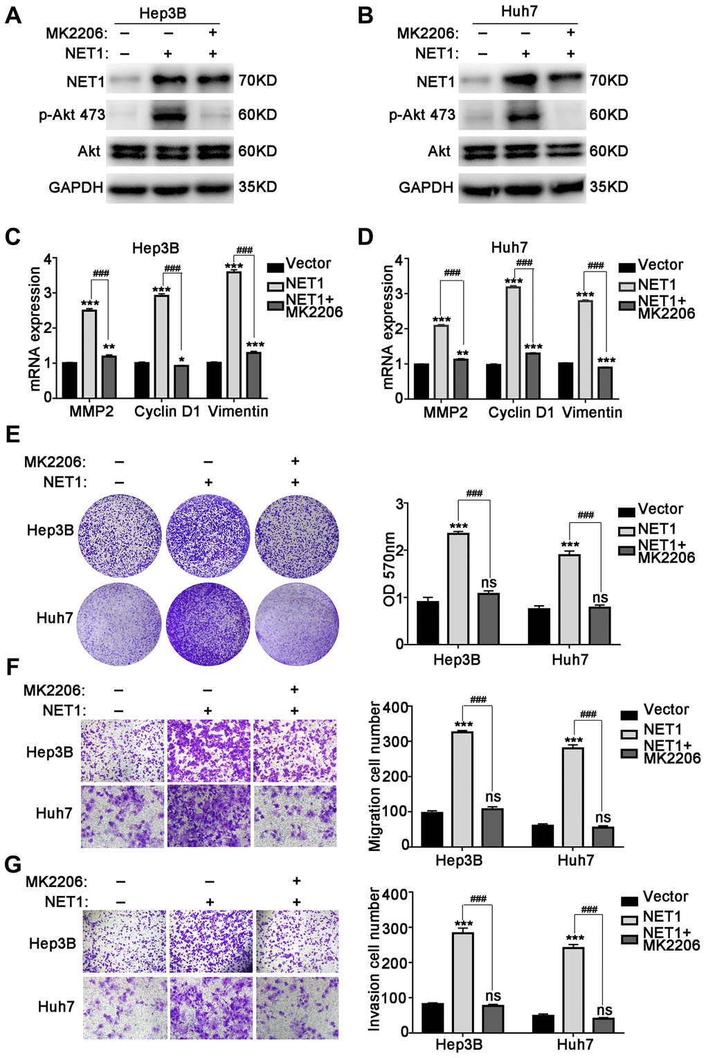 In addition, we determined whether the observed effect of NET1 on HCC progression is of Akt-dependent. To confirm whether the activation of Akt pathway can be blocked to reverse the NET1-induced HCC phenotype, MK2206, a potent Akt inhibitor, was incubated with NET1-overexpressed Hep3B and Huh7 cells. As demonstrated in Figure 7A and 7B, MK2206 suppressed the phosphorylation of Akt Ser473 in NET1-overexpressed Hep3B and Huh7 cells. We further demonstrated that the mRNA levels of MMP2, Cyclin D1 and Vimentin in NET1-overexpressed HCC cells were significantly lowered by MK2206 (Figure 7C, 7D). As revealed in Figure 7E–7G, the proliferation, migration and invasion of HCC cell lines induced by NET1 expression were successfully reversed through the use of MK2206. Collectively, these findings suggest that the NET1-induced effects are Akt-dependent.