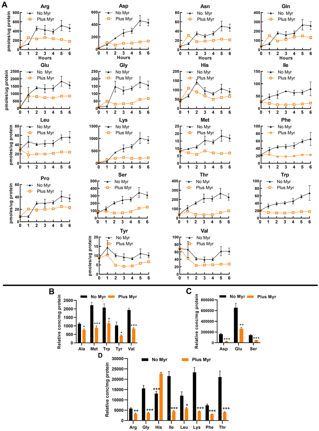 To examine free intracellular amino acid pools, we first used a classical heat-extraction protocol followed by derivatization of amine groups with a fluorescent tag, compound separation by high-pressure liquid chromatography (HPLC) and quantification of fluorescent signals in eluted compounds. Stationary phase cells were inoculated into fresh culture medium and a sample was taken immediately and then at 1 h intervals. We find that the 18 amino acids detected by this procedure show a statistically significant difference in pool size with untreated cells having a larger pool than drug-treated cells (Figure 2A) (Cys not detectable and Ala not changed by Myr-treatment). In untreated cells, the pool of most amino acids begins to increase by the 1 h time point. In contrast, most pools remain relatively constant in Myr-treated cells. This effect of Myr was independent of pool size and was observed for amino acids normally maintained at intracellular concentrations that are relatively low (e.g., Met and Tyr) or high (e.g., Glu and Ser).