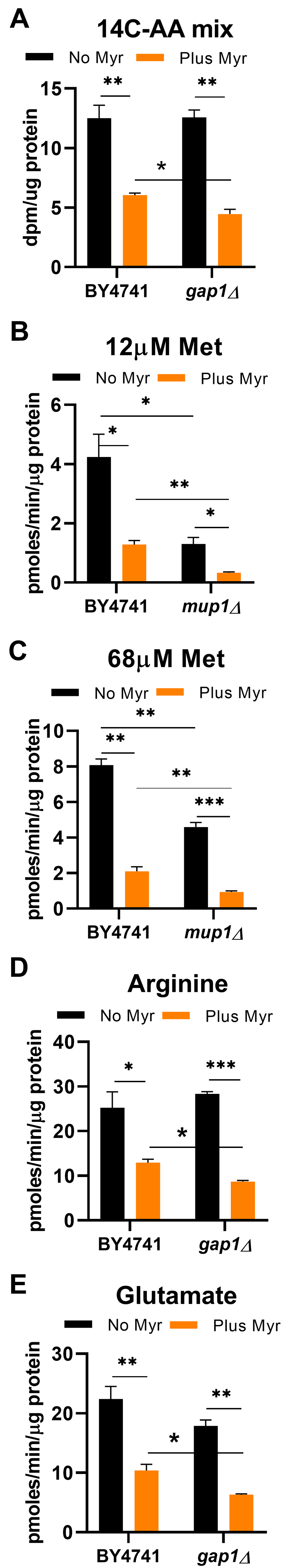 The general amino acid permease, Gap1, transports all 20 amino acids and could be responsible for reduced amino acid uptake [51]. To test this hypothesis, we measured uptake of the 14C-amino acid mixture in gap1Δ cells and found the rate to be identical to that in BY4741 cells without Myr treatment (Figure 3A). However, Myr treatment reduced uptake slightly more in gap1Δ than in WT cells (Figure 3A, compare BY4741 to gap1∆). Although the magnitude of difference was slight, the larger reduction of amino acid uptake in Myr-treated gap1Δ cells suggests that Gap1 activity contributes to the intracellular pool of amino acids even in the presence of Myr.