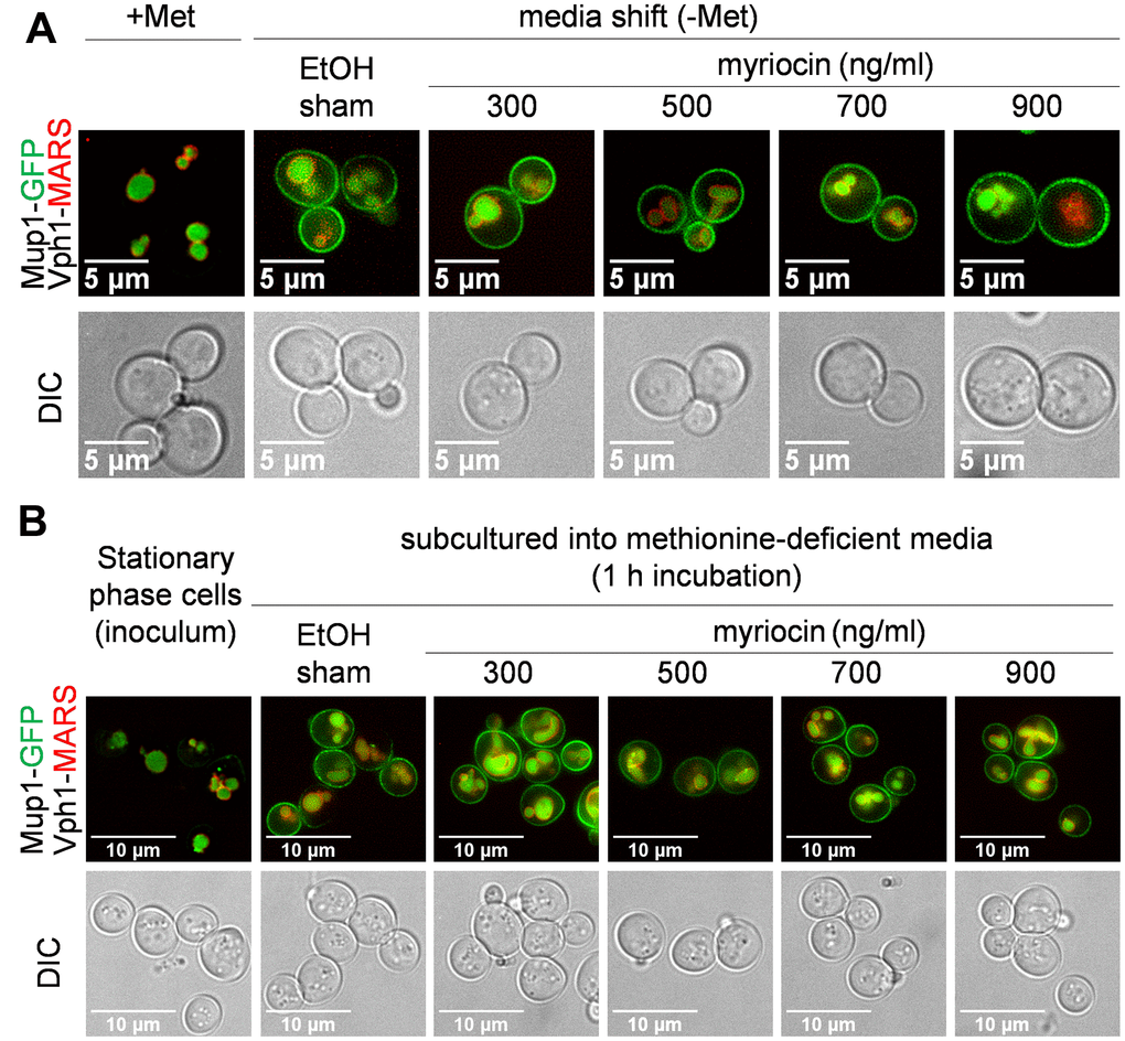 Based on data presented in this manuscript, we hypothesize that Myr treatment decreases amino acid pools by two mechanisms: (1) an acute decrease in the function of amino acid transporters, caused by decreased sphingolipid concentrations in membranes, and (2) increased endocytic clearance and vacuolar degradation of amino acid transporters following prolonged exposure to Myr. This latter effect may be related to misfolding of AATs, caused by changes in lipid composition at the PM and sensed by PM protein quality surveillance machinery [107]. Alternatively, the induction of endocytic clearance at later time points following exposure to Myr (Figure 5B, 5C) may suggest that this occurs as part of a cellular adaptive response, perhaps related to amino acid starvation. Additional experimentation will be required to distinguish between these possibilities.