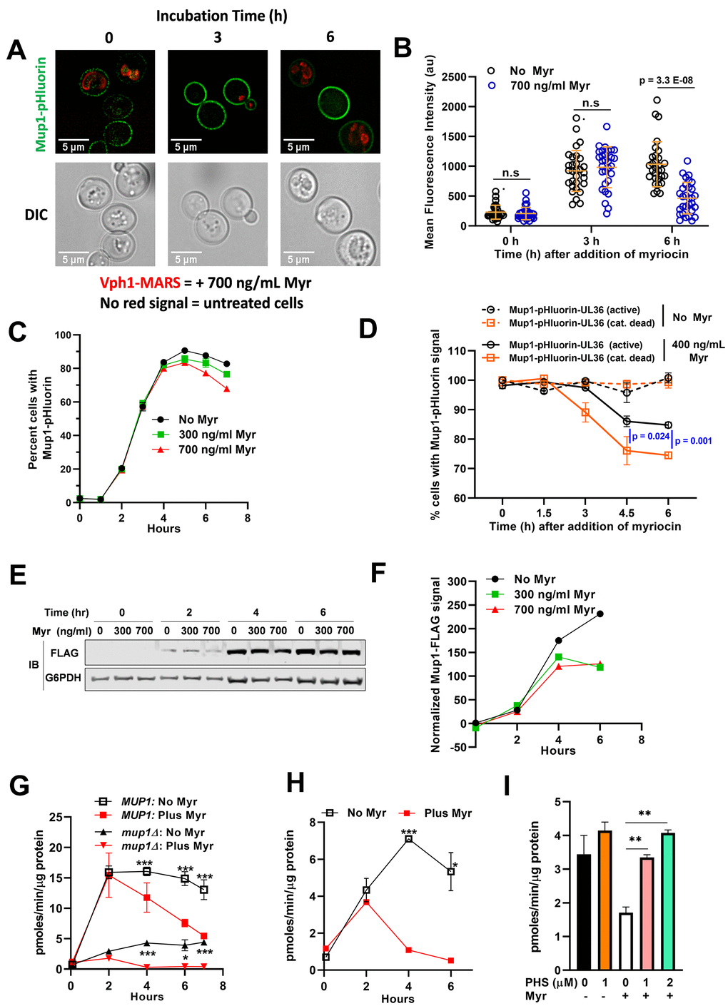 Based on these data, we hypothesized that Myr treatment gradually reduces the concentration of sphingolipids in membranes, which reduces Mup1 transport activity. To test this hypothesis, we analyzed Met uptake in culture medium supplemented with phytosphingosine, a downstream product of serine palmitoyltransferase (Figure 1A, SPT). Such supplementation is an established way to bypass both pharmacological and genetic impairment of SPT activity [72, 73]. While phytosphingosine had no effect on 3H-Met uptake in cells that were not treated with Myr, it restored uptake in Myr-treated cells (Figure 5I). Taken together, these results indicate that Myr-treatment induces a loss of Mup1 transport activity followed by endocytic clearance from the plasma membrane.