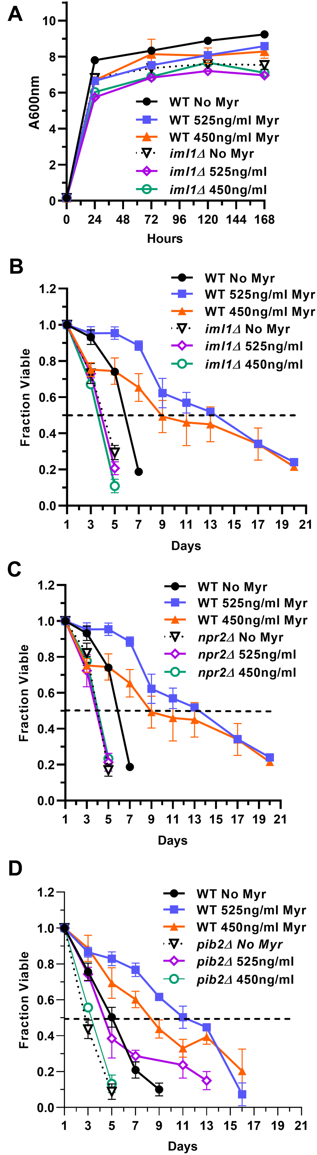 Indeed, we find statistically significant enhancement of CLS with untreated prototrophic BY4741 cells dropping to 0.5 fraction viable by day 4±1 while Myr-treated cells don’t drop to this level until day 14±2 (Figure 1B, Area Under the Curve, AUC, 95% CI: 3.515-5.178 vs 14.77-18.05). Lifespan assays with triplicate biological replicas were done 5 times with similar results. These findings validate previous CLS analysis of Myr-treated cells and reveal that the extended lifespan in the presence of Myr is also observed in prototrophic yeast strains.