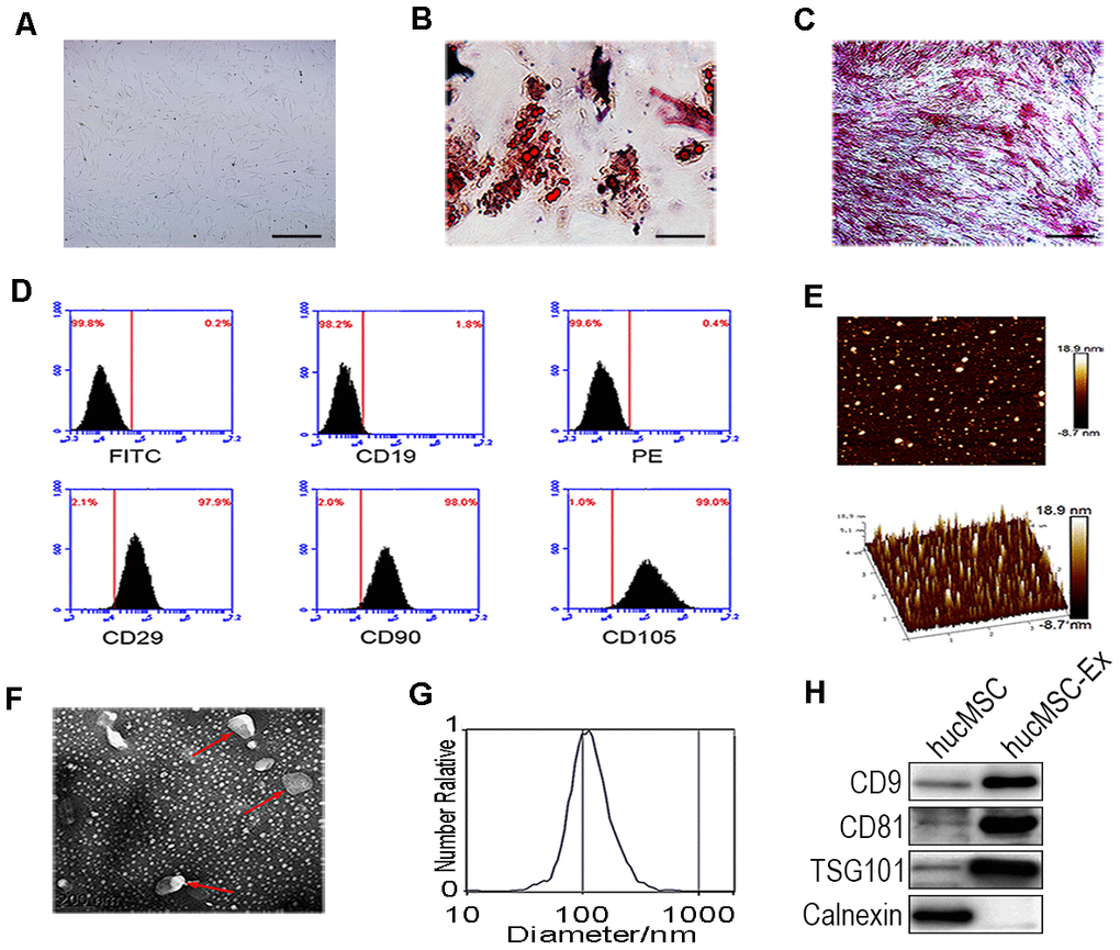 HucMSCs were isolated and purified, as previously described (Figure 1A). After induction in osteogenic and adipogenic medium, Oil-Red-O staining revealed numerous lipid droplets in the HucMSC cytoplasm (Figure 1B), and the cells became alkaline phosphatase positive (Figure 1C). These results showed that hucMSCs could be differentiated into both adipocytes and osteoblasts. Fluorescence-activated cell sorting (FACS) analysis demonstrated that hucMSCs highly express typical MSC surface markers, including CD29 (97.9%), CD90 (98.0%), and CD105 (99.0%), with the low expression of the B lymphocyte surface marker CD19 (1.8%, Figure 1D). HucMSC-ex were isolated and purified from the cell culture supernatant, as previously described. Atomic force microscope (AFM), Transmission electron microscope (TEM), nanoparticle tracking analysis (NTA) and western blot assays were used to identify the morphology, particle size distributions and counts, and surface marker expression levels of the isolated exosomes, respectively. AFM, TEM and NTA revealed that hucMSC-ex displayed a classical spherical morphology (Figure 1E, 1F), approximately 40–100 nm in diameter (Figure 1G). The western blot results indicated that hucMSC-ex expressed exosome-specific biomarkers, such as CD9, CD81, tumor susceptibility gene 101 (TSG101) but did not express calnexin (Figure 1H).