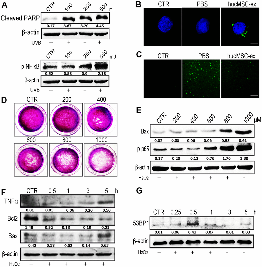 HaCaT cells were seeded in a six-well plate (1 × 105 cells per well) until they reached 70% confluence. Before UV radiation, the cells were washed with 1 ml PBS and suspended in 0.5 ml PBS. The cells were subsequently irradiated at 500 mJ/cm2 intensity, without the plastic dish lid. After UV irradiation, the cells were treated with basal medium containing 600 μg exosomes for 12 or 24 hours. A separate group of HaCaT cells was treated with basal medium containing 600 μM H2O2 and exosomes for 12 or 24 hours. PBS was used as a negative control. After exosome treatment, the cells were collected, and total RNA and proteins were detected, or the samples were fixed in 4% paraformaldehyde solution for histology analysis.