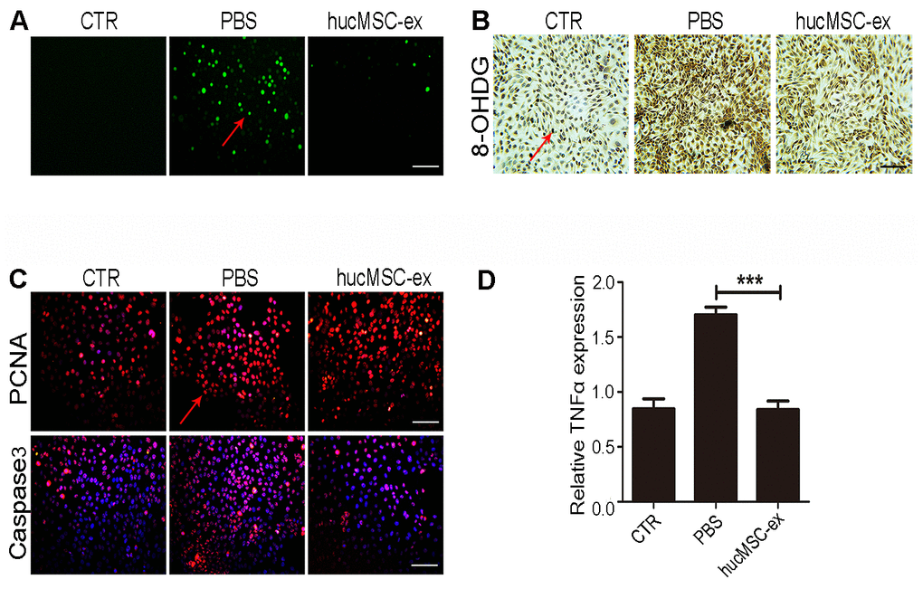 Exposure to UV radiation can cause lipid peroxidation, protein modifications, and DNA damage, promoting apoptosis-related signal transduction, contributing to the depletion of skin stem cells and its microenvironment, eventually leading to cell death [19]. We found that hucMSC-ex treatment also significantly reduced H2O2-induced ROS production compared with that in the PBS group (Figure 4A). The results of immunohistochemical staining showed that the expression levels of 8-OHDG significantly increased after H2O2 treatment in HaCaT cells, whereas hucMSC-ex treatment significantly reduced the 8-OHDG expression level (Figure 4B). Subsequently, the expression of proliferating cell nuclear antigen (PCNA) and apoptosis-related proteins (Caspase3) was detected by fluorescent immunochemistry. The results showed that 600 μM H2O2 treatment inhibited HaCaT proliferation and increased apoptosis, whereas hucMSC-ex treatment significantly promoted the proliferation of HaCaT cells and inhibited apoptosis (Figure 4C). Compared with that in the PBS group, quantitative real-time-polymerase chain reaction (qRT-PCR) analysis showed that hucMSC-ex treatment downregulated the expression of the inflammatory cytokine tumor necrosis factor-α (TNF-α) induced by oxidative stress (Figure 4D). These results further demonstrated that hucMSC-ex exerts cytoprotective effects by inhibiting oxidative stress.