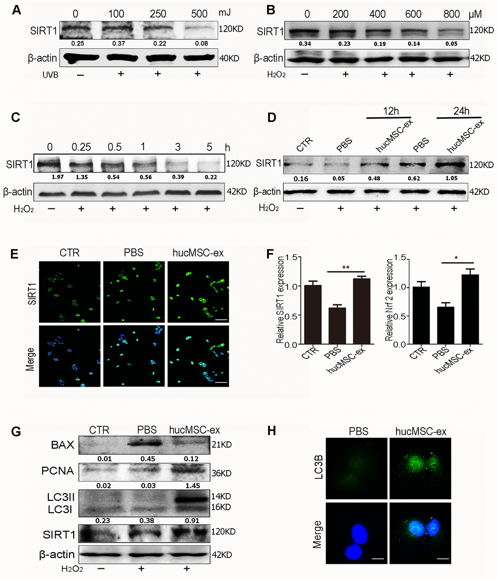 HaCaT cells were seeded in a six-well plate, grown to reach 50% confluence, and then co-cultured for 24 hours with 600 μM H2O2 and 600 μg hucMSC-ex. Cells were fixed in 4% paraformaldehyde for 30 min, permeabilized for 15 min with 0.1% Triton-X100, blocked for 30 min with 5% bovine serum albumin, and further incubated with rabbit monoclonal anti-SIRT1 (1:50, Bioworld Technology, USA), 14-3-3ζ (1:50, Bioworld Technology, USA) and LC3B (1:50, Bioworld Technology, USA) overnight at 4° C, followed by incubation with fluorescein isothiocyanate (FITC)-labeled anti-rabbit IgG secondary antibody (1:200) at 37° C for 30 min. The nuclei were counterstained with Hoechst 33342 (1:300; Sigma-Aldrich). The sections were observed with a fluorescent microscope (Nikon, Tokyo, Japan).