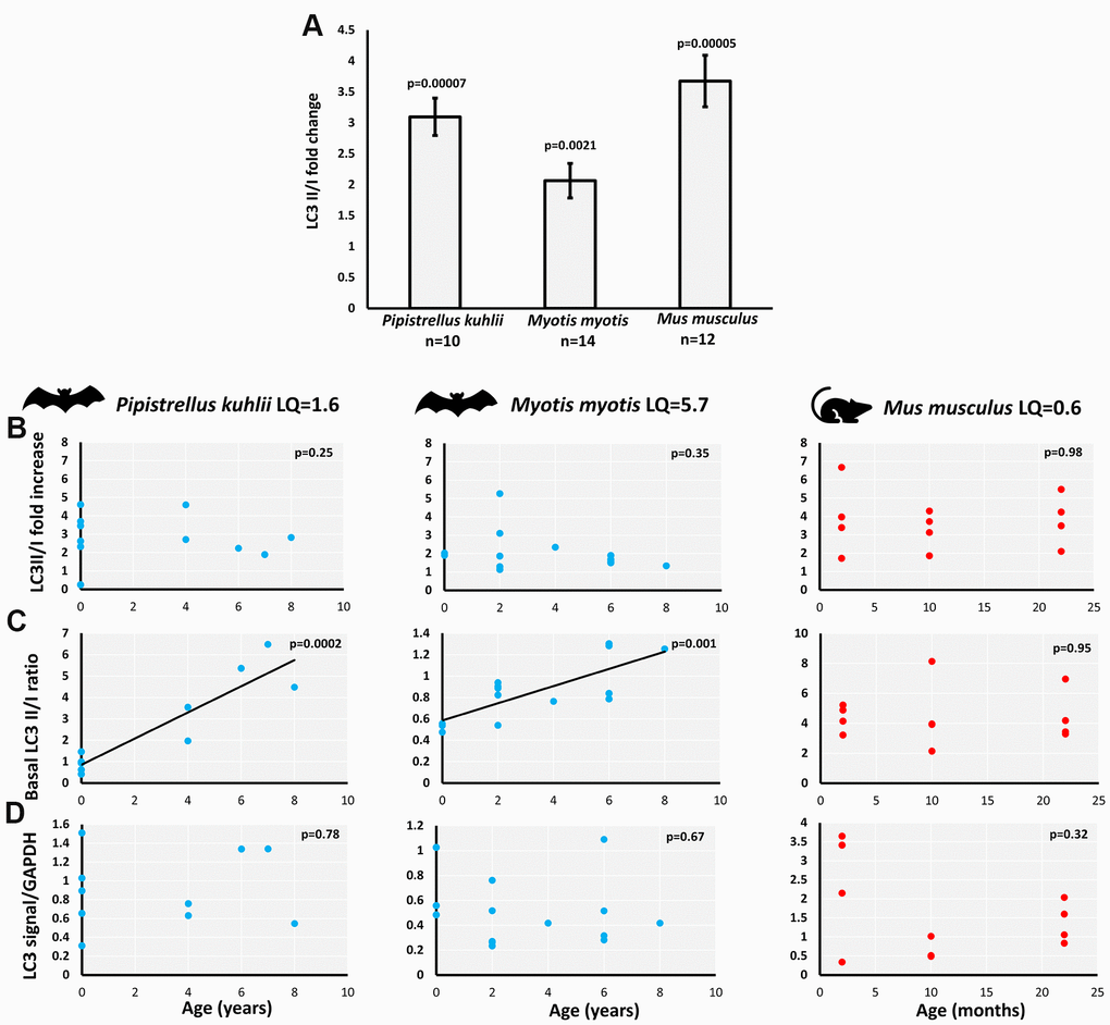 We avoided direct cross-species comparisons and focused on age-related changes within each species, as there might be species-specific differences in antibody affinity for LC3-I compared to LC3-II. The starvation-induced LC3II/I fold-change was not correlated with age in either bat species nor in mouse (Figure 1B). However, the basal LC3II/I ratio significantly increased with age in P. kuhlii and M. myotis, but not in mouse (Figure 1C). Lack of LC3II/I increase with age in mice did not change after including samples from different genetic backgrounds, nor when derived from flank skin rather than ear skin [19] (Supplementary Figure 2). Total LC3 signal (LC3II + LC3I normalized to GAPDH) did not show age-related changes in any of the tested species (Figure 1D).