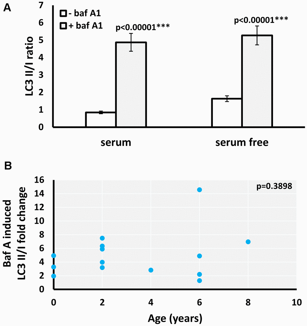 Increased LC3II/I ratio can be a result of either upregulation of autophagosome formation or a blockage of autophagic degradation [20]. To determine if the age-related increase of LC3II/I ratio observed results from defective autophagic degradation, we used bafilomycin A1 (Baf A1), an inhibitor of fusion between autophagosomes and lysosomes [21]. Both the basal and starvation-induced LC3II/I ratio significantly increased in the presence of Baf A1 in M. myotis (Figure 2A). Moreover, there was no significant age-associated change in the effect of Baf A1 on the basal LC3II/I ratio (Figure 2B), indicating that the age-related increase in basal LC3II/I ratio was likely not due to defective autophagy. Due to low numbers of cells obtained for the oldest cohort of P. kuhlii (6-8 years) it was not possible to include the autophagy inhibitor treatment for this species. Representative gels for all experiments are included in the Supplementary Figure 3.