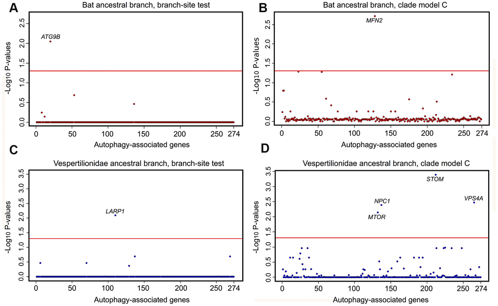 Phylogenomic selection tests were carried out on a suite of autophagy associated genes across eutherian mammals. Tested genes were: i) GO-associated with term autophagy; ii) represented by at least 50% of the 62 mined eutherian genomes; and, iii) detected in the assembled P. kuhlii transcriptome. Supplementary Figure 4 presents the outline of workflow used to isolate the final set of 274 genes for selection analyses. Tests of positive and divergent selection were carried out independently along the bat lineages and mouse (Supplementary Figure 5). CodeML calculates the likelihood-derived dN/dS rates (ω), where dN is defined as a number of non-synonymous substitutions per non-synonymous sites and dS is a number of synonymous substitutions per synonymous sites. Positive selection (ω >1) was detected in ATG9B along the ancestral bat branch and for LARP1 along the ancestral vespertilionid branch, with both genes showing significant sites under selection (Figure 3A, 3B and Supplementary Table 4). A number of sites had significant BEB scores for ATG9B in the Myotis ancestral branch, however these were present only in M. lucifugus, and represented a missing exon in other Myotis taxa. Within the individual lineages, positive selection was found in VMP1 and ZDHHC8 for P. kuhlii. Divergent selection was detected in MFN2 (ancestral bat branch) and in MTOR, STOM, VPS4A and NPC1 (ancestral vespertilionid branch) (Figure 3C, 3D and Supplementary Table 3). The ω values for MFN2, MTOR, STOM, VPS4A were >1 in the foreground and <1 in the background branch, indicating positive divergent selection acting along respective foreground branches. However, for NPC1 both foreground and background ω fell within the region of purifying selection with values of 0.12 and 0.24 respectively, suggesting that this gene may be under extreme evolutionary constraint and thus essential for normal cellular function. In the individual lineages, divergent selection was found in SFRP4 for the P. kuhlii (foreground ω>1, background ω<1). No genes found under selection in bats were found under selection in M. musculus, where positive selection was found in PSAP and divergent selection was found in SNX14 (foreground ω<1, background ω>1) (Supplementary Table 3) showing different evolutionary pressures acting on autophagy pathways in bats and mice.