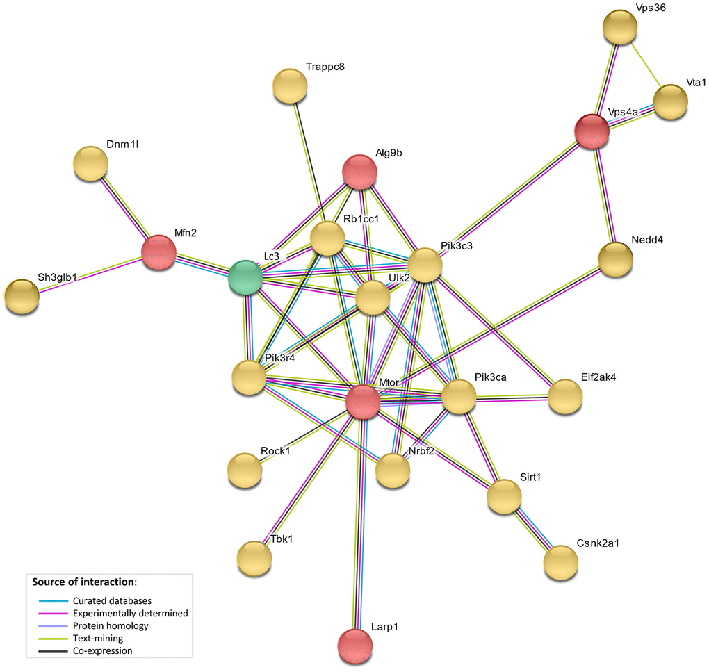 The network analysis (STRING database v.10. [23]) showed direct interaction between 5 genes under selection in the bat lineages (LARP1, MTOR, ATG9B, VPS4A and MFN2), and with 17 of autophagy-associated genes which positively correlated with age, and with the LC3 protein (Figure 4). This network showed a significant functional enrichment (FDR corrected p-value <0.05) for 152 Biological Process GO terms and 14 KEGG (Kyoto Encyclopedia of Genes and Genomes) pathways (Supplementary Tables 4, 5), including terms/pathways involved in the regulation and early events of autophagic activity.