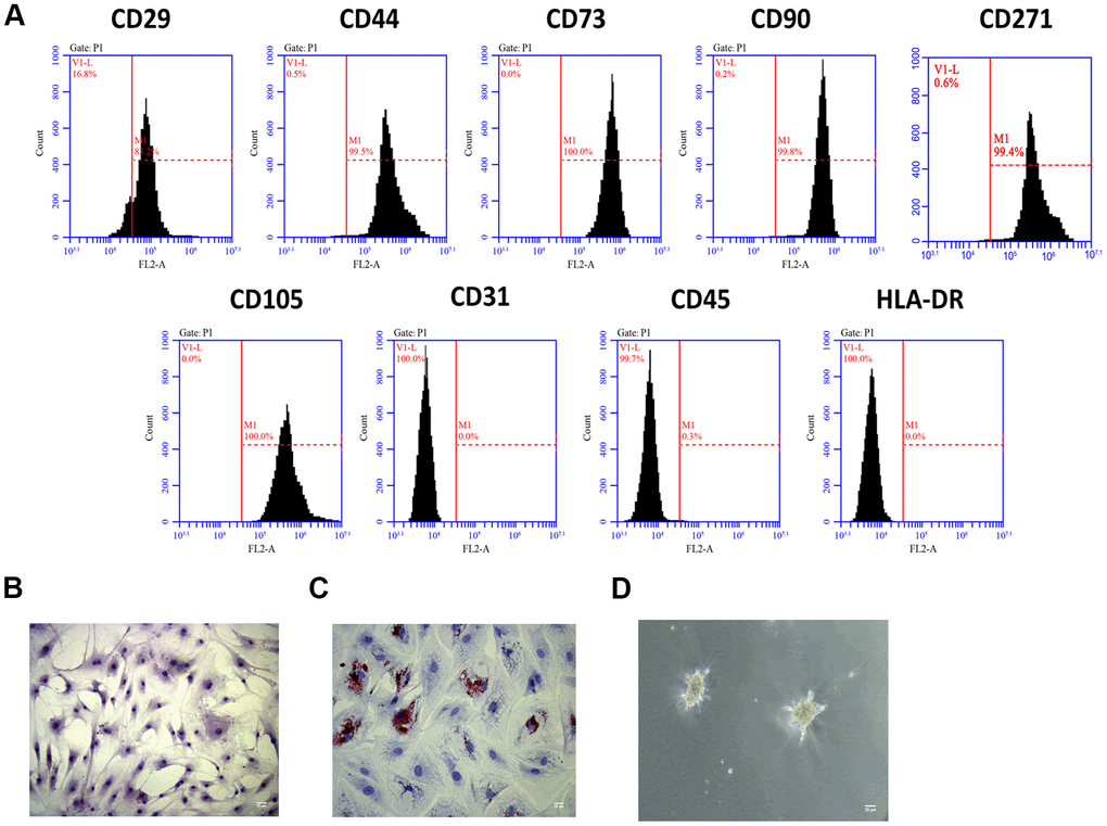 Bone marrow was collected from 5 healthy human donors (2 males and 3 females, aged 23-31 years). MSCs were isolated from bone marrow samples, as previously described [21]. Briefly, bone marrow cells were flushed and centrifuged in a 1.073 g/ml percoll density gradient (Pharmacia, USA). Then, the enriched cells were harvested from the interphase, and resuspended in culture medium, transferred into culture flasks with low glucose containing Dulbecco's Modified Eagle's Medium (LG-DMEM; Gibco, USA) supplemented with 10% fetal bovine serum (FBS; Gibco, USA) in humid air with 5% CO2 at 37° C. After reaching confluence, cells were collected and cryopreserved as primary MSCs. For subsequent experiments, MSCs at the third passage were used throughout the study, and cells were seeded at the required cell density, 24 hours before the experiments. To identify MSCs, cells were stained with positive MSC surface markers CD29, CD44, CD73, CD90, CD271, and CD105, and negative markers CD31, CD45, and HLA-DR (Abcam, China). Flow cytometry analysis was carried out on Cytomics FC500 MPL Flow Cytometer (Beckman Coulter, USA). Meanwhile, the differentiation of MSCs to adipocytes and chondrocytes was determined by using the adipogenesis differentiation kit (Gibco, USA) and StemPro™ Chondrogenesis Differentiation Kit (Gibco, USA) according to the manufacturer's instruction. Afterward, Oil Red O and Alcian Blue staining were carried out to determine adipocytes and chondrocytes, respectively [22].
