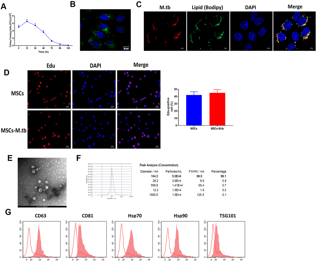 Given the reference [23, 24], we attempted to obtain a saturation of infection in MSCs and the results revealed that 6 hours at 1:50 multiplicity of infection (MOI) attained saturation of infection of M.tb (Figure 2A). Under these conditions, M.tb was taken up by MSCs, as imaged by confocal microscopy (Figure 2B). By using BODIPY 493/503 staining assay, we found that M.tb colocalized with neutral lipids in MSCs (Figure 2C). Also, Edu assay revealed that M.tb infection did not influence the proliferation of MSC (Figure 2D). After 72-hour infection, the conditioned medium by M.tb-infected MSCs was used to isolate exosomes (Exo-MSCs-M.tb). By performing TEM and NTA assays, we found that M.tb-infected MSCs secreted spherical shape vesicles with a diameter of 104.2 nm (98.1%) (Figure 2E, 2F). Furthermore, flow cytometric analysis demonstrated that the vesicles were positive for exosomal surface markers CD63, CD81, Hsp70, Hsp90, and TSG101 (Figure 2G). Collectively, these results suggest that we successfully established M.tb-infected MSCs model.