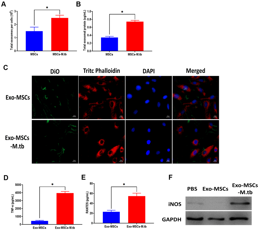 In this study, we measured the number of exosomes and exosomal protein concentrations in conditioned medium. The results showed that M.tb infection significantly increased exosome release in MSCs, compared with uninfected MSCs (Figure 3A, 3B). Next, we aimed to determine the role of Exo-MSCs-M.tb in macrophages. As displayed in Figure 3C, Exo-MSCs and Exo-MSCs-M.tb labeled with green DiO were internalized by macrophages. Also, we found that Exo-MSCs-M.tb increased the levels of tumor necrosis factor-α (TNF-α), RANTES, and iNOS production of macrophages, compared with Exo-MSCs (Figure 3D–3F). These results indicate that Exo-MSCs-M.tb might be associated with the pro-inflammatory activity of macrophages.