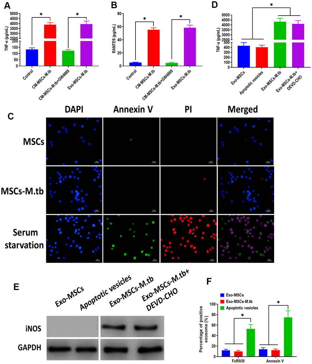 To further investigate that the pro-inflammatory response was induced by Exo-MSCs-M.tb, not mycobacterial components, GW4869, a pharmacological agent for blocking exosome generation [33], was added to the medium of M.tb-infected MSCs. We found that Exo-MSCs-M.tb and conditioned medium of M.tb-infected MSCs (CM-MSCs-M.tb) significantly increased the level of TNF-α and RANTES of macrophages, which was reversed by the addition of GW4869 (Figure 4A, 4B). These results suggest that Exo-MSCs-M.tb might be a major component to induce the pro-inflammatory response. To determine whether the M.tb infection caused apoptosis, MSCs and M.tb-infected MSCs were stained with annexin A, an indicator of surface-exposed phosphatidylserine, and with propidium iodide (PI), an indicator of late apoptosis [34]. As shown in Figure 4C, the negative staining of annexin A and PI were observed in MSCs and M.tb-infected MSCs, whereas the positive staining of both was found in MSCs underwent serum starvation-induced apoptosis. Moreover, to eliminate the possibility that apoptotic vesicles might lead to the pro-inflammatory response of macrophages, we measured the level of TNF-α and RANTES of macrophages treated with apoptotic vesicles isolated from serum starvation-treated MSCs. The results demonstrated that apoptotic vesicles could not induce the pro-inflammatory response of macrophages, while Exo-MSCs-M.tb isolated from MSCs treated with or without DEVD-CHO, caspase-3 inhibitor [35], displayed a similar role in activating the pro-inflammatory response of macrophages (Figure 4D, 4E). Furthermore, staining of FcRII/III and annexin V displayed a higher level in apoptotic vesicles isolated from serum starvation-treated MSCs than both Exo- MSCs-M.tb and Exo-MSCs (Figure 4F). Together, these results indicate that Exo-MSCs-M.tb was the primary inducer for the pro-inflammatory response of macrophages.