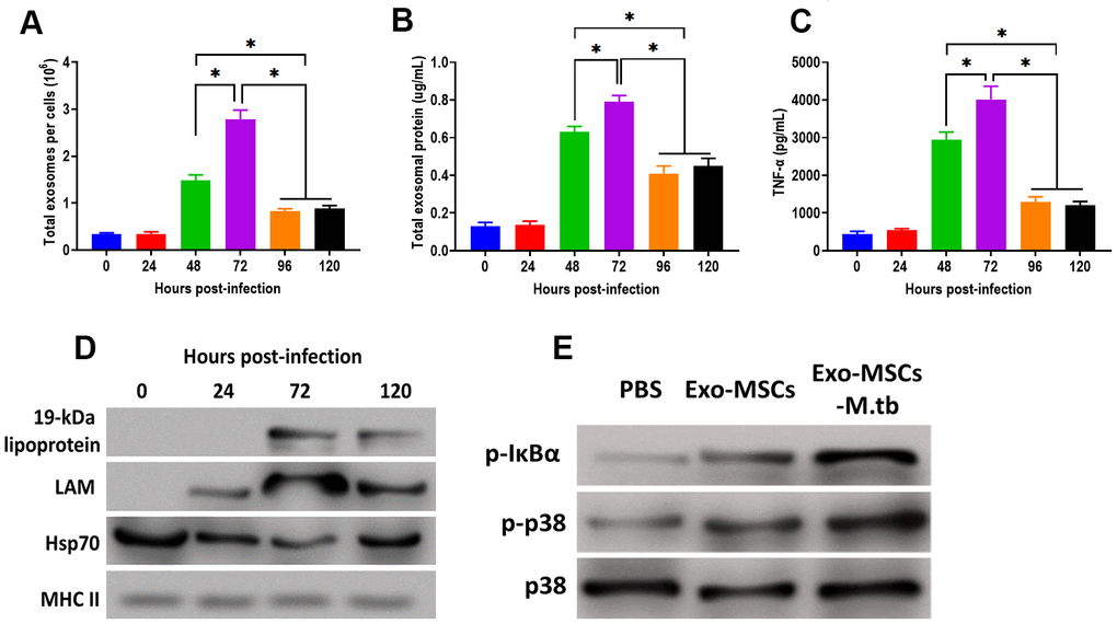 After M.tb infection, the ability of exosome releasing of MSCs displayed a time-dependent matter. We found that the number of exosomes and exosomal protein concentration were significantly increased at 48 hours post-infection and reached the highest level after 72 hours of M.tb infection (Figure 5A, 5B). In addition, the effect of Exo-MSCs-M.tb on the pro-inflammatory response also replied on when Exo-MSCs-M.tb was isolated after infection. The results revealed that Exo-MSCs-M.tb isolated at 72 hours post-infection induced the highest level of the pro-inflammatory response (Figure 5C). Meanwhile, Exo-MSCs-M.tb obtained at 24, 96, and 120 hours post-infection failed to initiate the increase of TNF-α of macrophages. Furthermore, the highest levels of LAM and 19-kDa lipoprotein of Exo-MSCs-M.tb were found at 72 hours post-infection (Figure 5D), suggesting that the mycobacterial components were trafficked to Exo-MSCs-M.tb after M.tb infection. Moreover, we observed that the phosphorylation levels of IκBα and p38 were increased in macrophages treated with Exo-MSCs-M.tb, compared with PBS and Exo-MSCs (Figure 5E), suggesting that MAPK and NF-κB pathways are involved in the pro-inflammatory response induced by Exo-MSCs-M.tb.