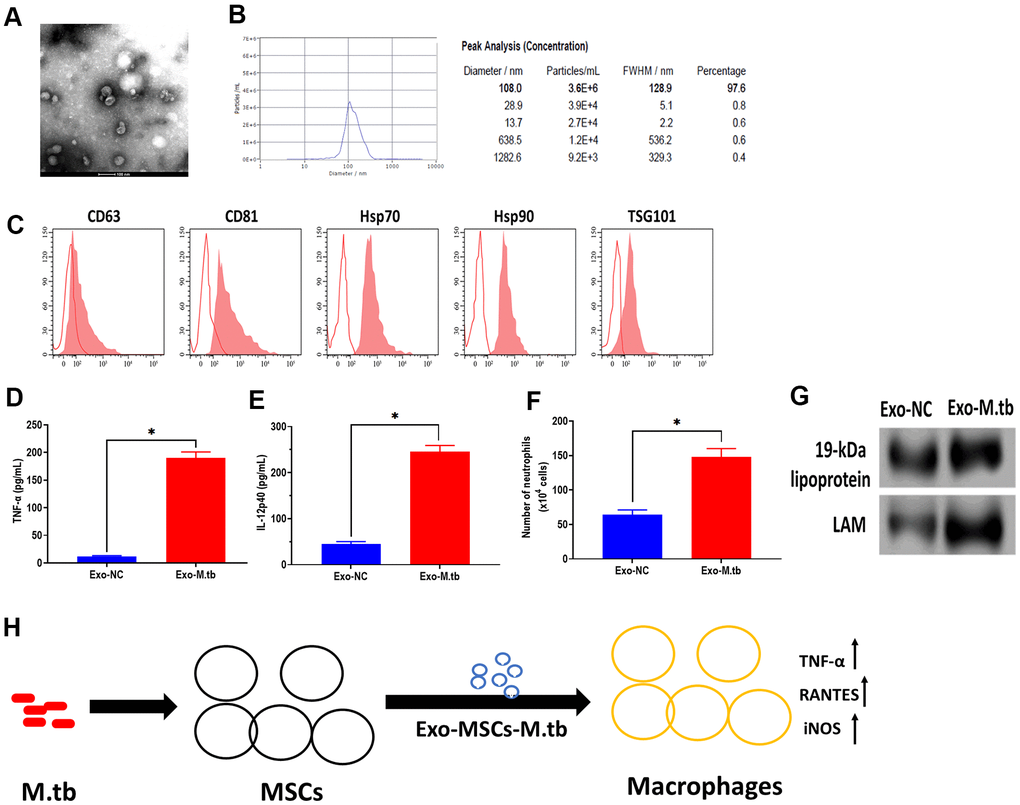 To further determine whether Exo-MSCs-M.tb can induce the pro-inflammatory response in vivo, C57BL/6 mice were injected intranasally with PBS, Exo-MSCs, and Exo-MSCs-M.tb. The levels of cytokine IL-12p40 and TNF-α in the lungs were investigated at 0 and 3 days post-injection. The results showed that both IL-12p40 and TNF-α were significantly increased in mice treated with Exo-MSCs-M.tb, compared with PBS and Exo-MSCs (Figure 6E, 6F). More neutrophils were also observed in Exo-MSCs-M.tb-treated mice, relative to those injected with PBS and Exo-MSCs (Figure 6G). Meanwhile, we collected exosomes from the bronchoalveolar lavage fluid (BALF) of C57BL/6 mice treated with Exo-MSCs-M.tb at 5 days post-injection. Through TEM and NTA assays, vesicles isolated from BALF displayed a round shape with a diameter of 108.0 nm (97.6%) (Figure 7A, 7B). Also, exosomal surface marker CD63, CD81, Hsp70, Hsp90, and TSG101 were positively expressed in the vesicles (Figure 7C). These results together confirmed the identification of exosomes. Then, we injected BALF-derived exosomes into C57BL/6 mice, and we found the level of IL-12p40, TNF-α, and neutrophil infiltration were increased in the lungs, suggesting BALF-derived exosomes can also induce the pro-inflammatory response in vivo (Figure 7D, 7E). Furthermore, the protein levels of 19-kDa lipoprotein and LAM of BALF-derived exosomes were higher than those of control exosomes, suggesting that the mycobacterial components were trafficked in BALF-derived exosomes (Figure 7G).