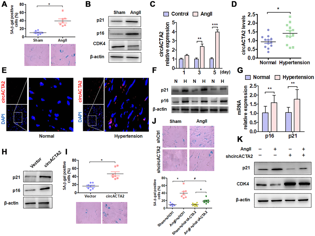 To determine the pathophysiological relevance of circACTA2 expression, we detected the expression level of circACTA2 in artery tissues of patients with hypertension, an age-related vascular disease, by RT-qPCR and FISH. The results showed that a higher level of circACTA2 expression was observed in the artery tissues of hypertensive patients than in the normal vessel tissues (Figure 1D). FISH results showed that circACTA2 was localized in the cytoplasm and upregulated in the vessel tissues of hypertensive patients (Figure 1E). To determine whether the expression of senescence-associated genes was altered in artery tissues of patients with hypertension, we performed RT-qPCR and Western blot to detect p16 and p21 expression in vascular tissues. The results showed that p16 and p21 protein and mRNA levels were significantly upregulated in artery tissues of hypertensive patients (Figure 1F and 1G). Next, we explored whether the upregulation of circACTA2 is responsible for VSMC senescence. We overexpressed circACTA2 in VSMCs by transfecting circACTA2 expression plasmids (Supplementary Figure 2A). We found that the expression level of p21 and p16 was substantially elevated in circACTA2-overexpressing cells (Figure 1H), accompanied by a corresponding increase in the number of SA β-gal-positive cells (Figure 1I). These results imply that circACTA2 plays an important role in VSMC senescence. To further test whether Ang II-induced VSMC senescence is mediated by circACTA2, circACTA2 was knocked down in VSMCs by transfection of plasmids expressing circACTA2 short hairpin RNA (shcircACTA2) (Supplementary Figure 2B), and Ang II-induced VSMC senescence was examined. As a result, knockdown of circACTA2 significantly reduced VSMC senescence induced by Ang II, as shown by decreased number of SA β-gal-positive cells (Figure 1J and Supplementary Figure 2C). Consistently, Ang II-induced upregulation of p21 expression level was abrogated in circACTA2-knocked down VSMCs (Figure 1K), and the knockdown of circACTA2 reversed the inhibitory effect of Ang II on CDK4 expression (Figure 1K). These findings indicate that Ang II induces cellular senescence at least in part by upregulating circACTA2 in VSMCs.