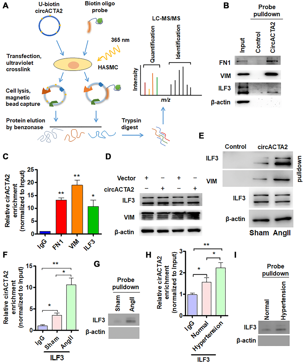 In order to elucidate how circACTA2 acts as a regulator of cellular senescence, we identified proteins interacting with circACTA2 by using both RNA antisense purification (RAP) and U-biotin-labeled circACTA2 pull-down followed by quantitative liquid chromatography-mass spectrometry (LC-MS) (Figure 2A). We quantitatively compared the proteins captured with antisense oligonucleotides or biotinylated circACTA2 with their corresponding control-captured proteins. As a result, 181 proteins were quantified. Among these proteins, each had more than two unique peptides in the two biological replicate purifications performed, indicating the suitability of the approach. We reproducibly identified the part of circACTA2-strongly enriched proteins that met our enrichment criteria (mean log2 > 2.0, P < 0.05, moderated t-test), and confirmed that circACTA2 interaction with FN1, VIM and ILF3, but not β-actin, was highly specific, as detected by immunoblotting with anti-FN1, anti-VIM and anti-ILF3 antibodies (Figure 2B). RNA immunoprecipitation (RIP) performed with these three antibodies further validated their interaction (Figure 2C). Among these, ILF3, a RNA-binding protein, has attracted our attention, which binds to the 3′ untranslated region (UTR) of several mRNAs to enhance mRNA stability and is implicated in regulation of the cell cycle [21]. Therefore, we further investigated whether circACTA2 affects ILF3 expression, and whether Ang II impacts the interaction between circACTA2 and ILF3. Western blot analysis showed that overexpression of circACTA2 in VSMCs, which mimicked Ang II stimulation, did not significantly affect ILF3 and VIM expression (Figure 2D). However, oligonucleotide pull-down assay performed with the probe of circACTA2 revealed that circACTA2 interaction with ILF3 or VIM was enhanced in Ang II-treated VSMCs (Figure 2E). To examine whether endogenous ILF3 interacts with circACTA2 under pathophysiological condition in VSMCs, we performed the RIP and RNA pulldown. As shown in Figure 2F and 2G, circACTA2 was significantly enriched in the anti-ILF3 immunoprecipitates relative to IgG, and this could be further enhanced in VSMCs treated with Ang II. RNA oligo pulldown also confirmed that Ang II treatment promoted circACTA2 and ILF3 interaction. In the artery tissues, we also found that compared with normal artery tissues, ILF3 and circACTA2 interaction significantly increased in the artery tissues of hypertensive patients (Figure 2H and 2I). These results suggest that circACTA2 and ILF3 interaction happens under pathophysiological condition in the cell. Taken together, these results support the notion that circACTA2 interacts with ILF3 in VSMCs and that their interaction is strengthened by Ang II exposure, suggesting that circACTA2 interaction with ILF3 might be involved in Ang II-induced cellular senescence of VSMCs.