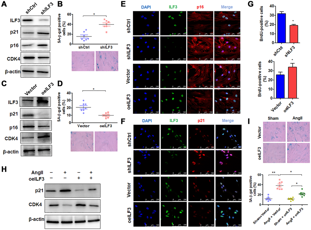 Because the above findings indicated ILF3 interaction with circACTA2, and previous study has shown that ILF3 functions as a repressor of cellular senescence and its expression is downregulated in senescent fibroblasts [4], we used loss- and gain-of-function approaches to examine the role of ILF3 in VSMC senescence. When VSMCs were transfected with ILF3-specific short hairpin RNA (shILF3) to knock down the expression of ILF3, the expression of cellular senescence markers p21 and p16 was increased in ILF3-silenced VSMCs compared with those transfected with shCtrl, with an obvious decrease in CDK4 expression level, as shown by Western blot analysis (Figure 3A). Accordingly, the proportion of SA β-gal-positive cells was significantly increased in ILF3-knocked down VSMCs (Figure 3B). On the contrary, overexpression of ILF3 mediated by ILF3-expressing vector (oeILF3) reduced p21 and p16 expression and enhanced CDK4 expression level (Figure 3C), accompanied by a marked decrease in the proportion of cells positive for the SA β-gal activity (Figure 3D). Further, immunofluorescence staining of p16 and p21 showed that knockdown of ILF3 increased and overexpression of ILF3 decreased the expression of p16 and p21 compared to their corresponding control (Figure 3E and 3F). To provide additional evidence that ILF3 regulates VSMC senescence, BrdU incorporation assay was performed to evaluate the effect of ILF3 on VSMC proliferation. The results showed that ILF3 silencing by shRNA significantly inhibited the proliferation of VSMCs, whereas its overexpression facilitated VSMC proliferation (Figure 3G). These results clearly indicate that ILF3 suppresses cellular senescence in VSMCs. To further confirm that ILF3 functionally participates in Ang II-induced senescence, we treated ILF3-overexpressing VSMCs with Ang II and assessed cellular senescence via detecting the expression of senescence-associated genes as well as by SA β-gal staining. Western blot analysis showed that overexpression of ILF3 largely abrogated Ang II-induced upregulation of p21 expression and decreased the downregulation of CDK4 expression by Ang II (Figure 3H). Simultaneously, Ang II-induced cellular senescence was rescued by ILF3 overexpression in VSMCs, as evidenced by SA β-gal staining (Figure 3I). These results suggest that ILF3 represses Ang II-induced VSMC senescence via interacting with circACTA2.
