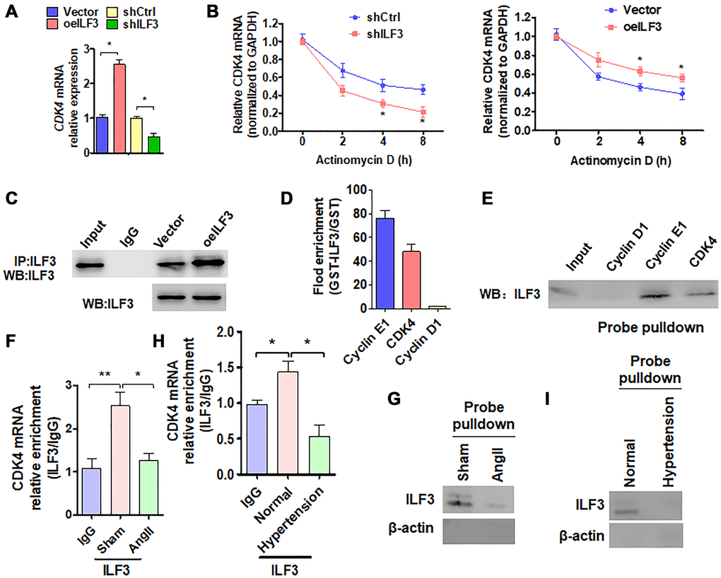 We further examined whether ILF3 is bound to the 3′ UTR of CDK4 mRNA. First, CoIP was performed to confirm that enough endogenous ILF3 could be pulled down by anti-ILF3 antibody (Figure 4C). Next, in vitro RNA immunoprecipitation (RIP) experiments were performed to examine the association between ILF3 and the CDK4 mRNA 3′ UTR. We expressed and purified recombinant GST-ILF3 fusion protein in Escherichia coli, and used the recombinant protein to pull down mRNAs specifically associated with it. RT-qPCR showed that mRNA of CDK4 and cyclin E1, as a positive control, was dramatically enriched in the recombinant protein-RNA complex pulled down by GST-ILF3. The specificity of ILF3 interaction with cyclin E1 or CDK4 mRNA was confirmed by the absence of association between ILF3 and cyclin D1 mRNA (Figure 4D). Consistent with this, biotin-labeled oligo-nucleotide pull-down followed by western blot analysis also revealed that ILF3 protein could be detected in the precipitates pulled down with the CDK4 3′ UTR probe as well as with cyclin E1 3′ UTR probe, but the cyclin D1 3′ UTR probe could not pull down ILF3 protein (Figure 4E). To further confirm whether endogenous ILF3 protein interacts with CDK4 mRNA under physiological condition, we performed the RIP and RNA pulldown. Compared with the control group, Ang II treatment significantly reduced CDK4 mRNA interaction with ILF3 (Figure 4F and 4G). Similar results were obtained in vivo, interaction between CDK4 mRNA and ILF3 was significantly reduced in artery tissues of hypertensive patients relative to the normal artery tissues (Figure 4H and 4I). These findings suggest that endogenous ILF3 protein and CDK4 mRNA interact with each other under pathophysiological condition in VSMCs. These results supported the notion that ILF3 stabilizes CDK4 mRNA by binding to its 3′ UTR.