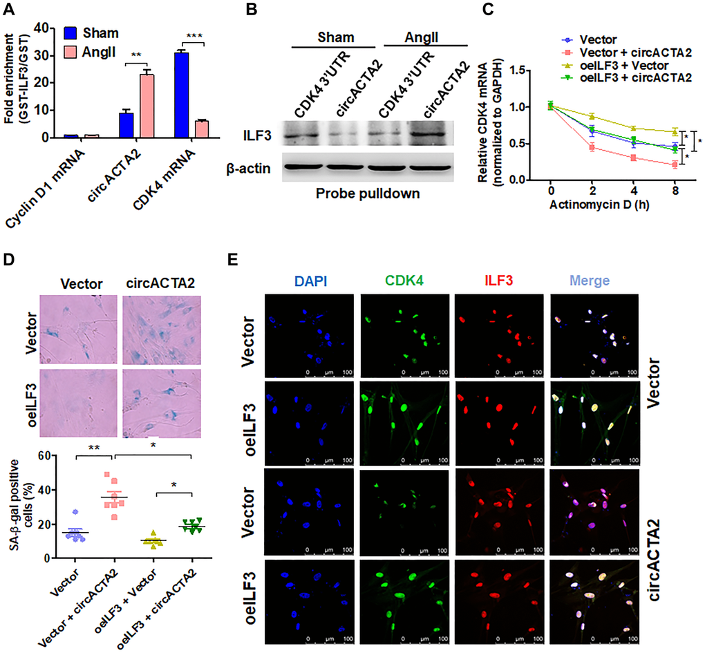 In the present study, we found a novel role of circACTA2 in VSMC senescence induced by Ang II. First, circACTA2 expression was significantly upregulated in Ang II-induced VSMC senescence and in the vascular walls of old mice, and circACTA2 overexpression promoted VSMC senescence, whereas its knockdown had the opposite effects. Second, Ang II-induced VSMC senescence was mediated by circACTA2 interaction with ILF3, which reduces ILF3 association with CDK4 mRNA. Third, decreased interaction of ILF3 with CDK4 mRNA rendered CDK4 mRNA unstable and thus attenuated its protein expression. Fourth, the downregulation of CDK4 expression led to Ang II-induced VSMC senescence.