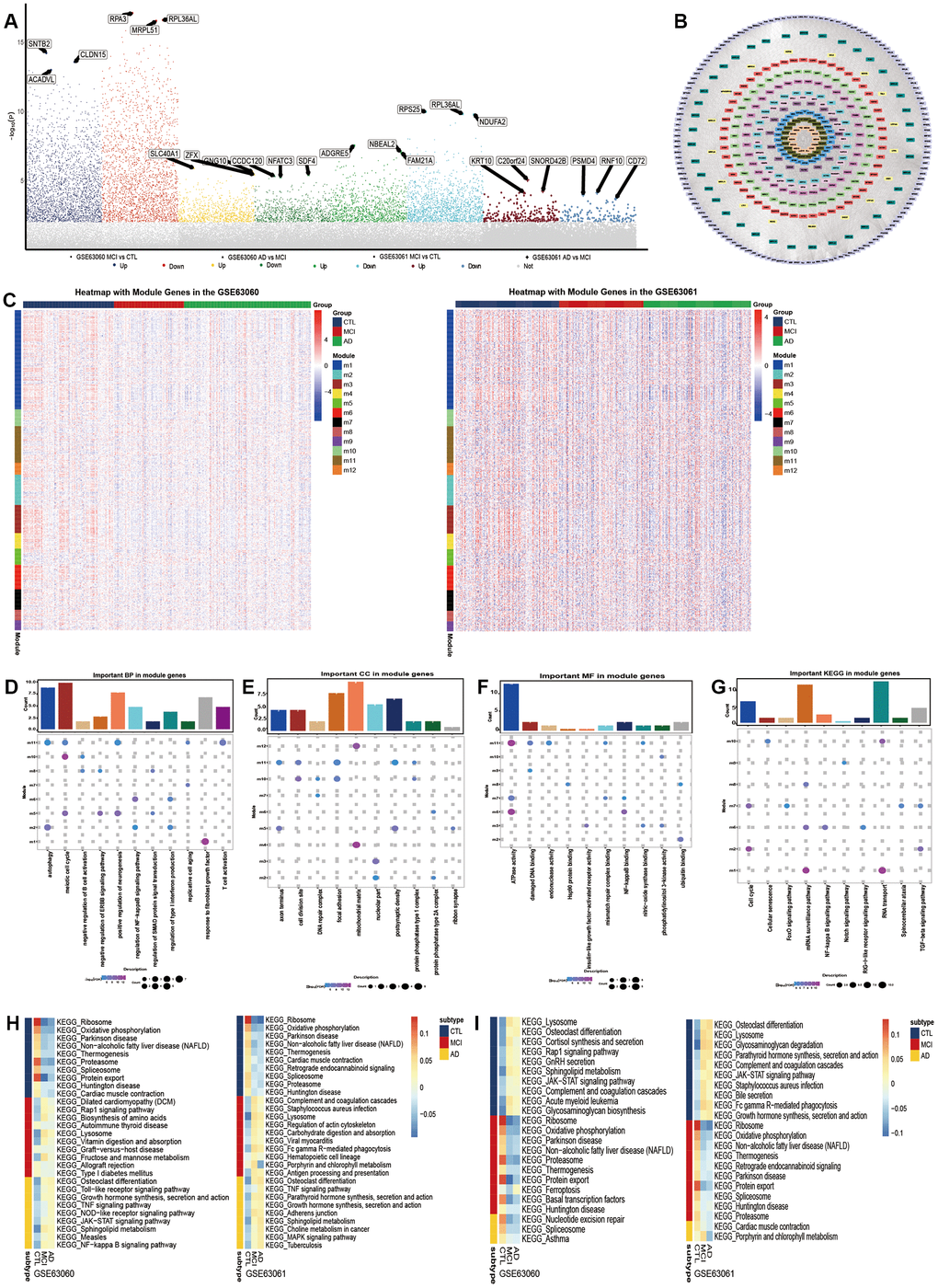 To identify the key genes in the process from mild cognitive impairment to Alzheimer’s disease, we obtained a PPI network composed of 1901 DEGs. These network genes were clustered into 12 interacting modules (Figure 2B). The trend in the expression of the modular gene in the two groups of data was similar, but the difference in the GSE63061 data was more obvious (Figure 2C). The enrichment analysis showed that the module genes were involved in 2107 biological processes (BP), 366 cell components (CC) and 385 molecular functions (MF). The involvement was mainly in the biological functions related to the nerves, in aging, immunity and inflammation (Figure 2D–2F). The results of the KEGG showed that the module genes were mainly enriched in the cell cycle, immune inflammation related signal pathway (Figure 2G). Importantly, in both datasets the results of the subGSEA indicated that Osteoclast differentiation and the Toll- like receptor signaling pathway showed a continuous up-regulation from healthy people to patients with AD (Figure 2H). However, Spliceosomes and Proteasomes continued to decrease (Figure 2I). It is suggested that these signaling pathways can promote or inhibit the development of Alzheimer’s disease.