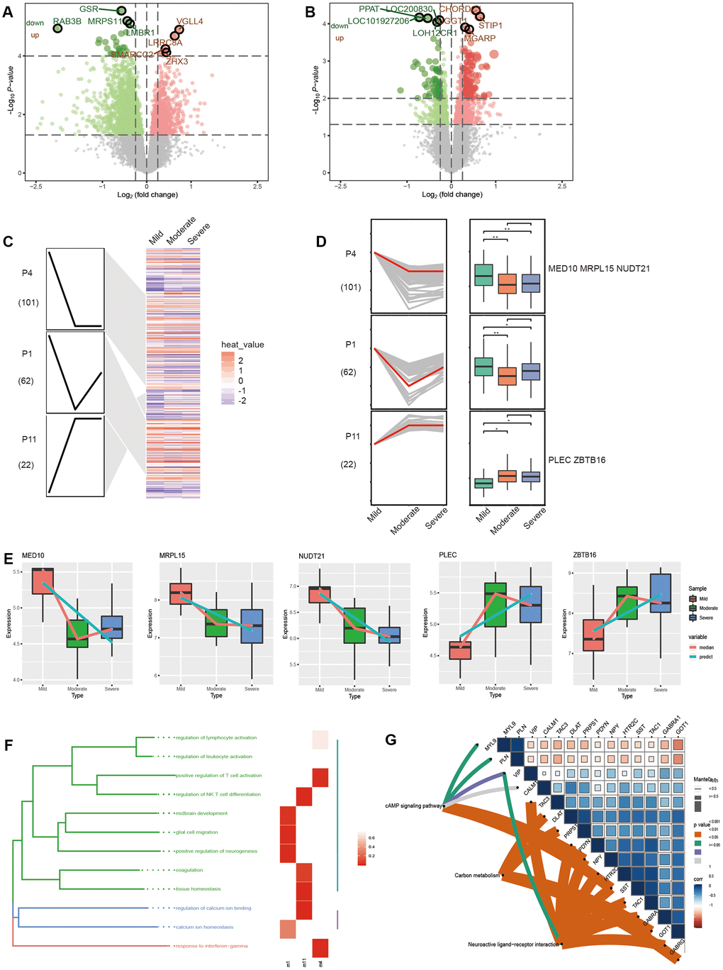 There are different pathological stages in patients with AD. As AD worsens, the genes that continuously express maladjustment may be involved in this process. First, from the GSE84422 database, we obtained the DEGs between the patients with moderate and mild AD (Figure 3A), and between the patients with severe and moderate AD (Figure 3B). Then, by STEM analysis of these DEGs, we identified the genes that were continuously up-regulated or down-regulated from mild to severe AD (Figure 3C). Surprisingly, five genes (MED10, MRPL15, NUDT21, PLEC and ZBTB16) coincided with the PPI network genes (Figure 3D). We also determined the trend in the expression of these five genes in different modules of the STEM. The expression of the MED10, MRPL15 and NUDT21 genes were up-regulated, while the PLEC and ZBTB16 genes were down-regulated. We thought that these genes may be AD risk genes. Their specific expression trends in three different stages of AD were consistent with the up- and down-regulation of the STEM modules (Figure 3E). The enrichment analysis showed that the persistent disordered genes were mainly related to biological functions such as immune inflammation, neuroregulation, the cAMP signaling pathway, carbon metabolism, and neuroactive ligand−receptor interaction (Figure 3F, 3G).