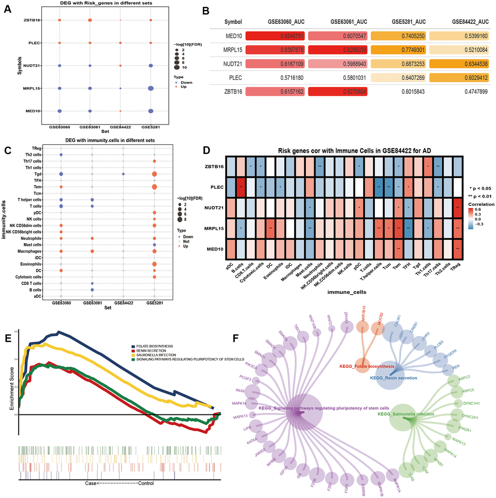 After the previous enrichment analysis, we found that immunity played an important role in the process of AD. Therefore, we identified the differences of the 24 kinds of immune cells in AD (Figure 4C). We found that Neutrophils and Macrophages were significantly up-regulated in all three datasets. We found that T cells and T helper cells were significantly down-regulated in the blood samples. We calculated the correlation between the potential AD risk genes and the immune cells. We found that MED10 and NUDT21 had the highest positive correlation with Treg cells. MRPL15 had the highest positive correlation with Tem cells. PLEC had the highest positive correlation with B cells. ZBTB16 had the highest positive correlation with Th1 cells (Figure 4D). The results of the GSEA showed that the expression of the five potential AD risk genes were mainly concentrated in the up-regulated salmonella infection, signaling pathways regulating pluripotency of stem cells (Figure 4E, 4F).