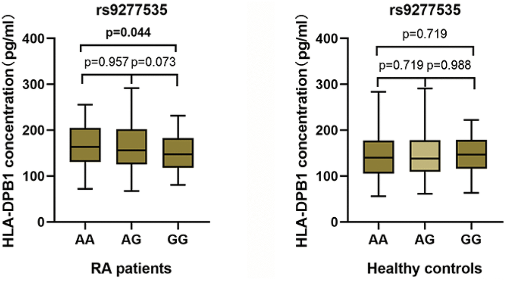 In brief, the HLA-DPB1 rs9277535 polymorphism down-regulated the risk of RA in the Chinese Han. Thus, in-depth studies on more individuals in other populations should be conducted.