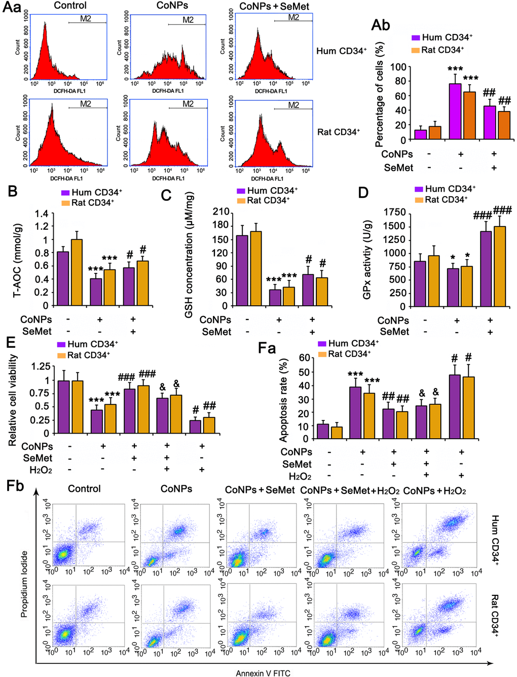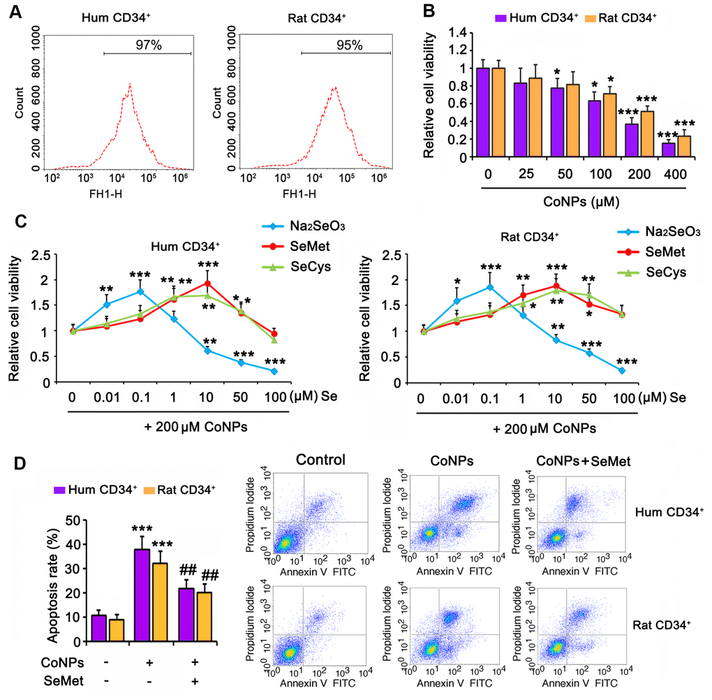 Based on the results from our pilot experiments, CoNP concentrations ranging from 0‒1000 μM were used. Human and rat CD34+ HSCs/HPCs were cultured in medium containing CoNPs. Various concentrations of Na2SeO3, selenomethionine (SeMet), and selenocysteine (SeCys) were added to the cells 15 h before CoNP treatment to determine their protective effects. Cells underwent all measurements 24 h after the treatments.