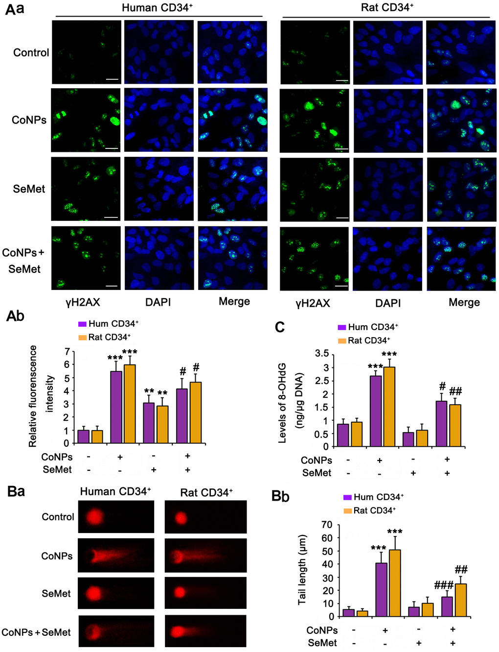 This study found that SeMet stimulated DNA damage response signals because signaling molecules, such as p-ATM, p-ATR, γH2AX, p-p53, p53 and BRCA1, were increased by SeMet in the presence or absence of CoNPs. However, SeMet probably did not cause DNA damage according to the results of the comet assay, 8-OHdG measurement, and electron microscopy. Moreover, when SeMet was removed from the culture medium, the proliferation of CD34+ HSCs/HPCs was restored. This also suggested that CD34+ HSCs/HPCs did not suffer from DNA damage.