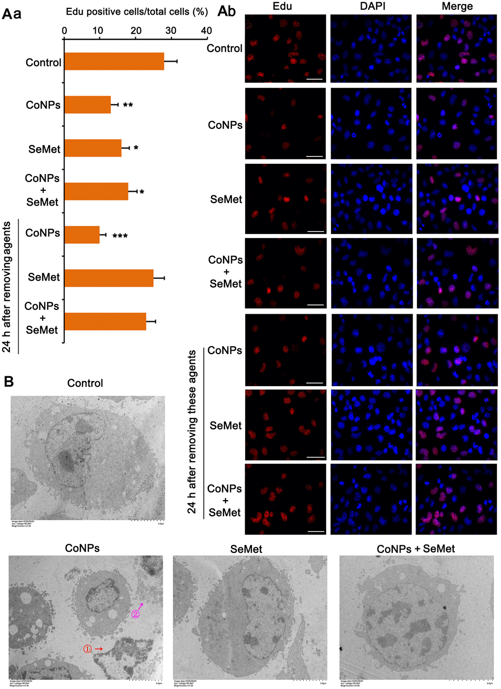 Activation of DNA damage response signals induces cell cycle arrest. This can temporarily inhibit cell proliferation so that cells have more time to repair damaged DNA and avoid passing on this damage to their daughter cells. Therefore, we performed the EdU staining assay to examine whether cell proliferation was affected upon the activation of the DNA damage response signal. The results showed that treatment with CoNPs (p < 0.01), SeMet (p < 0.05), and SeMet + CoNPs (p < 0.05) suppressed cell proliferation (Figure 4A). Cell proliferation was still inhibited 24 h after CoNPs were removed from the cells; however, cell proliferation was restored 24 h after SeMet and SeMet + CoNPs were removed.