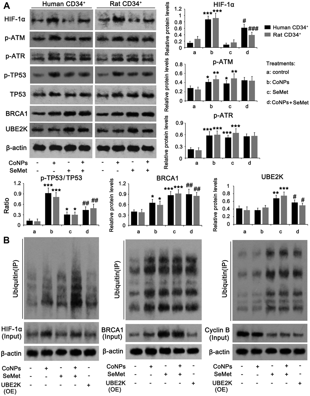In summary, SeMet protected CD34+ HSCs/HPCs from CoNPs by elevating their antioxidative capacity and activating DNA damage response signals. As shown in Figure 8G, both SeMet and CoNPs stimulated the DNA damage response signals, but the former did not cause DNA damage. SeMet inhibited the CoNP-induced increase in HIF-1α, thereby disrupting the inhibitory effect of HIF-1α on BRCA1. Moreover, SeMet promoted BRCA1-mediated ubiquitination of cyclin B at K48 by upregulating UBE2K. Therefore, SeMet enhanced cell cycle arrest and DNA repair after exposure to CoNPs. This study reveals a novel protective mechanism underlying the protective effect of SeMet against CoNPs.