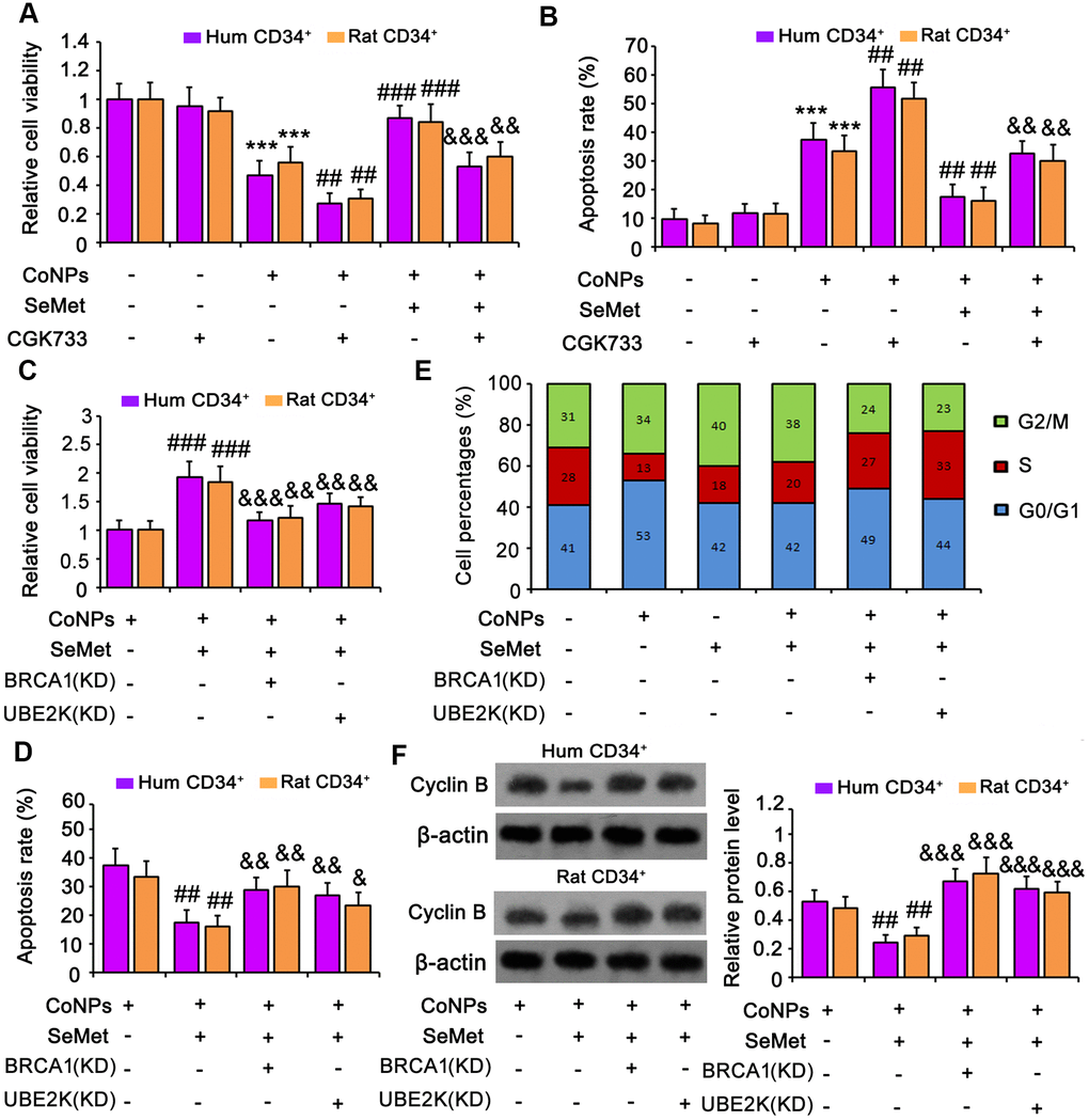To determine whether BRCA1 and UBE2K were involved in the protection against CoNPs, these factors were silenced in CD34+ HSCs/HPCs. Knockdown of BRCA1, a key downstream effector of ATM/ATR signaling, abrogated the protection of SeMet against CoNPs, as indicated by cell viability (Figure 6C) and apoptosis (Figure 6D and Supplementary Figure 1C) assays. Although UBE2K is not a downstream target of ATM/ATR signaling, depletion of UBE2K also impaired the protective effect of SeMet. Moreover, silencing either BRCA1 or UBE2K abolished the inhibition of cyclin B by SeMet in CoNP-treated cells (p < 0.001, Figure 6F). Treatment with CoNPs increased the percentage of cells in the G0/G1 phase but decreased the percentage in the S phase (Figure 6E and Supplementary Figure 2A). Treatment with SeMet, alone or in combination with CoNPs, increased the percentage of cells in the G2/M phase, whereas it decreased the percentage in the S phase. However, knockdown of BRCA1 or UBE2K reversed the decreased cell percentages in the S phase caused by SeMet and CoNPs.