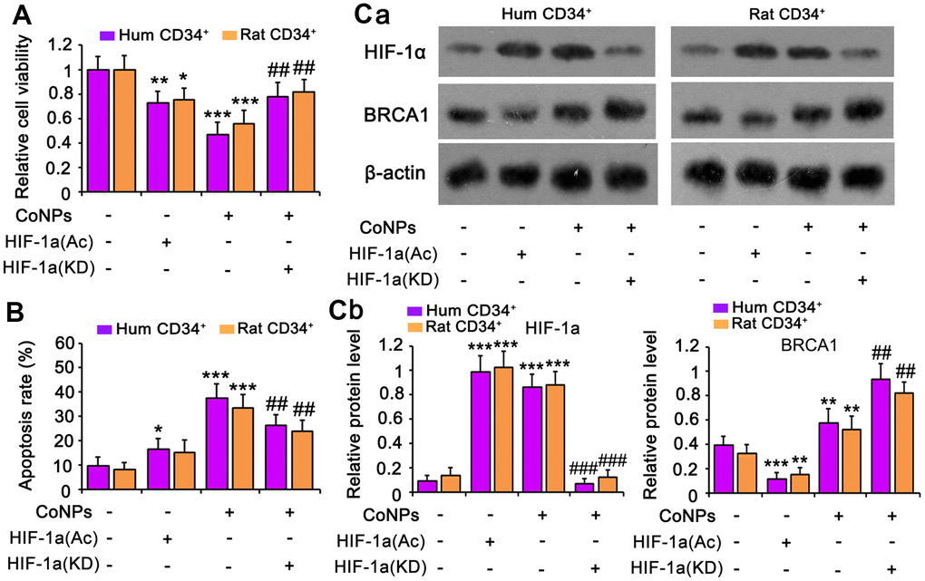 HIF-1α inhibits BRCA1 expression [38, 39]. Although CoNPs promoted BRCA1 expression, we noticed that the promoting effect of CoNPs was weaker than that of SeMet. We used an activator of HIF-1α (dimethyloxalyglycine) to mimic the activation of HIF-1α by CoNPs. The activator increased the expression of HIF-1α but decreased that of BRCA1 (Figure 7C). This resulted in cell damage as indicated by the cell viability (Figure 7A) and apoptosis (Figure 7B and Supplementary Figure 2B) assays. However, the silencing of HIF-1α resulted in attenuation of the toxic effect of CoNPs on CD34+ HSCs/HPCs.