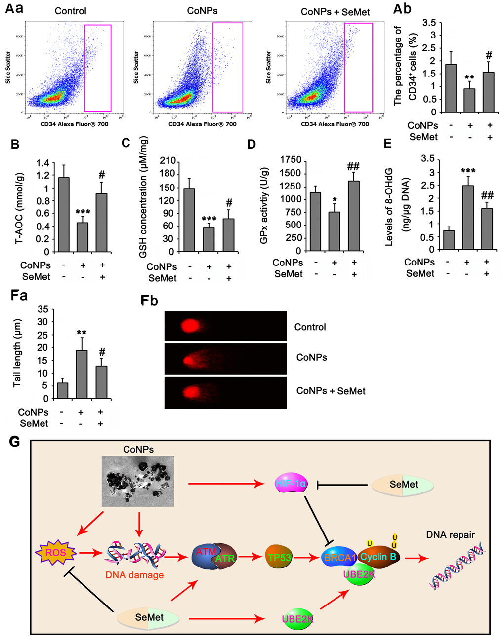 In animal study, as indicated by flow cytometry assay, the number of rat CD34+ HSC/HPCs in bone marrow was reduced by CoNPs (p<0.01, Figure 8A), but the reduction was partially reversed by SeMet (p<0.05 vs. CoNPs group). The number of red blood cells in peripheral blood was not changed, but the MCV and HCT% were increased after the injection of CoNPs. The total WBC and some types of WBC, such as LYMN, OTHR, and EO, in peripheral blood were also increased after the injection of CoNPs. SeMet partially suppressed the increase of these WBC (Table 1). SeMet attenuated the reduction of T-AOC (p < 0.05 vs. CoNPs group, Figure 8B), GSH (p < 0.05 vs. CoNPs group, Figure 8C) and GPx activity (p < 0.01 vs. CoNPs group, Figure 8D) caused by CoNPs. Long term exposure to CoNPs also caused the DNA damage in rat CD34+ HSC/HPCs, based on the increase of 8-OHdG level (p < 0.001, Figure 8E) and the tail length (p < 0.01, Figure 8F) in comet assay after CoNPs treatment. The CoNPs-induced DNA damage was relieved by SeMet.