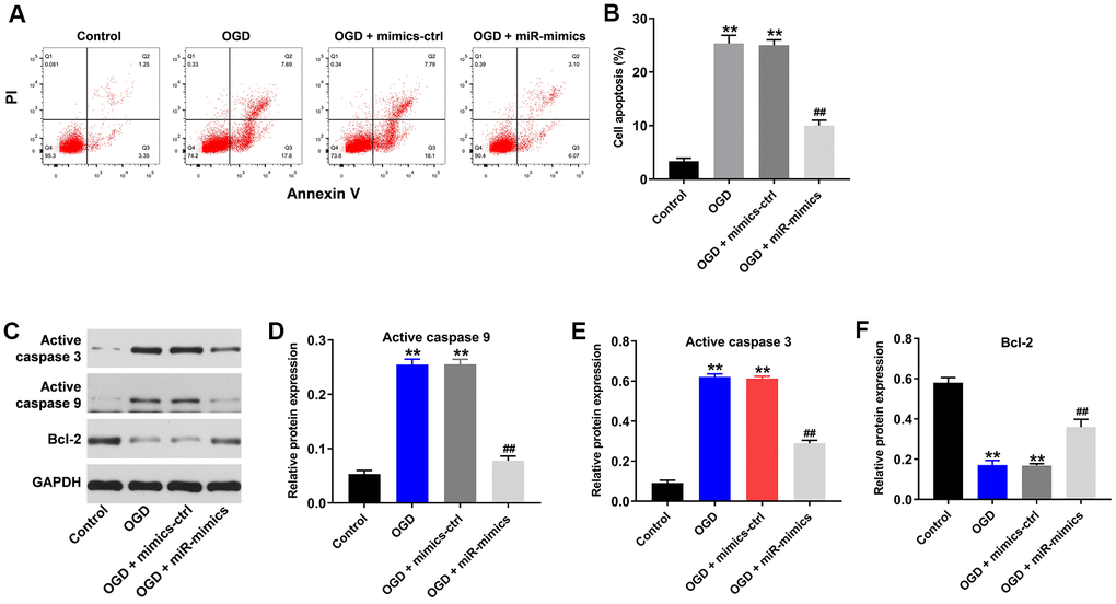 Using flow cytometry to detect cell apoptosis, we observed that OGD clearly induced apoptosis in HT22 cells (Figure 2A, 2B). Consistent with the increased apoptosis, levels of active caspase 3 and active caspase 9, two pro-apoptosis enzymes, were significantly increased in HT22 cells in the presence of OGD (Figure 2C–2E). Conversely, levels of the anti-apoptotic protein (Bcl-2) was significantly decreased in HT22 cells in the presence of OGD (Figure 2C, 2F). All of these effects were reversed in the presence of miR-27a-3p mimics (Figure 2A–2F).