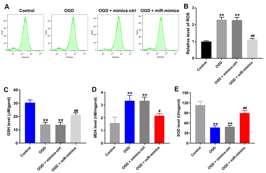 Using flow cytometry to detect levels of reactive oxygen species (ROS) in HT22 cells, we found that OGD upregulated ROS levels in HT22 cells (Figure 3A, 3B). OGD also significantly reduced the levels of the antioxidants glutathione and superoxide dismutase and increased the levels of malondialdehyde, a marker of oxidative stress, in the supernatants of HT22 cells (Figure 3C–3E). Again, all of these effects were at least partially reversed in the presence of miR-27a-3p mimics (Figure 3A–3E). Thus, miR-27a-3p mimics clearly suppressed OGD-mediated oxidative injury in HT22 cells.