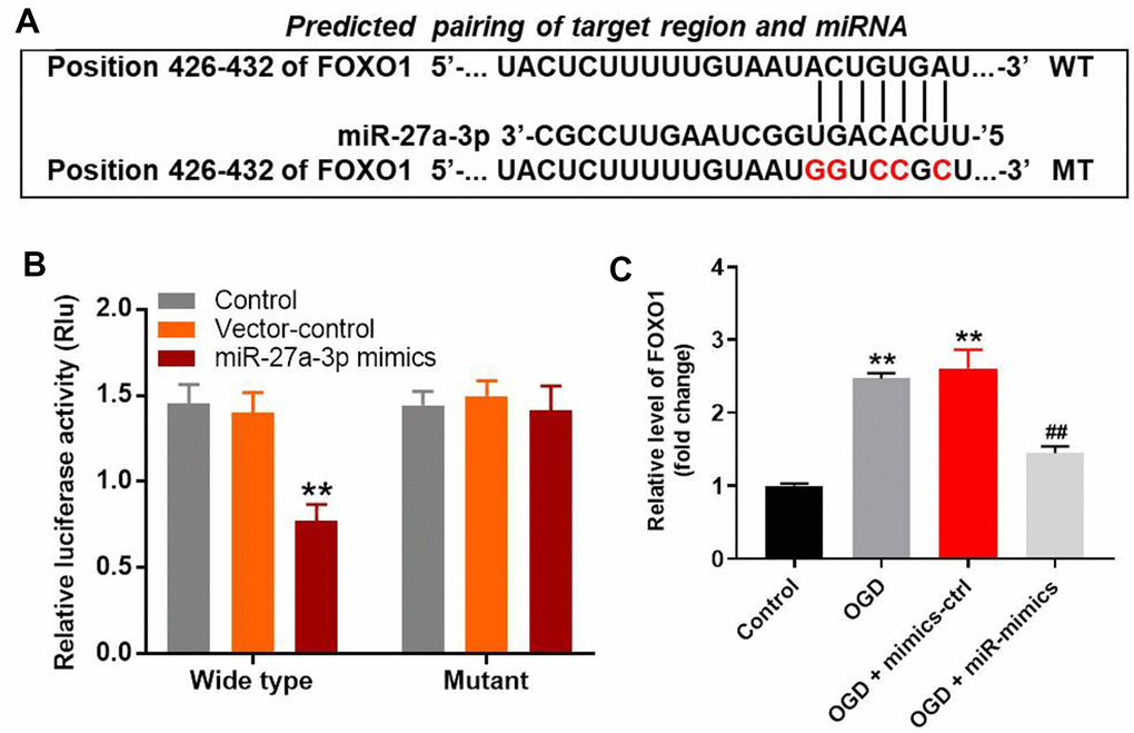 Forkhead box class O1 (FOXO1) is a transcription factor which is involved in cellular process [10]. In addition, some reports have indicated that FOXO1 can regulate the progression of I/R injury. For instance, Chen YQ et al found that FOXO1 could alleviate the progression of myocardial ischemia-reperfusion injury [11]; Wang D et al indicated that FOXO1 downregulation could inhibit the progression of renal ischemia-reperfusion injury [12]. Meanwhile, FOXO1 is known to promote the development of CI/R [13]. However, the correlation between miR-27a-3p and FOXO1 in CI/R remains unclear.