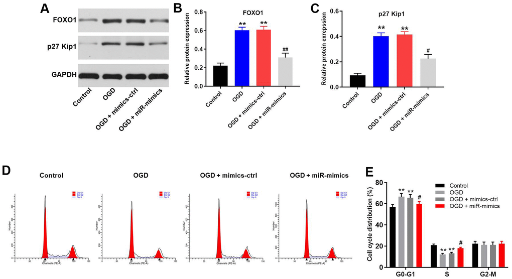 We used western blotting to explore the mechanism by which OGD mediates the progression of CI/R in vitro. As shown in Figure 5A–5C, OGD upregulated protein expression of FOXO1 and p27 Kip1, the cell cycle mediator [14], in HT22 cells, while this phenomenon was suppressed in the presence of miR-27a-3p mimics. Moreover, flow cytometric analysis confirmed that OGD induced G1 arrest in HT22 cells, while overexpression of miR-27a-3p partially reversed the effect of OGD on cell cycle distribution (Figure 5D, 5E). These results suggest that OGD induces G1 arrest in HT22 cells via FOXO1/p27 Kip1 signaling, and that effect is reversed by miR-27a-3p.