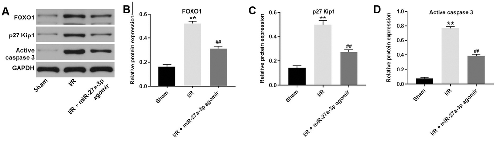 Finally, a rat model of CI/R was established to explore the effect of miR-27a-3p on CI/R progression in vivo. As indicated in Figure 6A, 6B, miR-27a-3p agomir significantly reduced cerebral infraction area in CI/R rats. In addition, miR-27a-3p agomir reversed CI/R-induced increases of cerebral water content and the TUNEL positivity rate (Figure 6C, 6D). Consistent with our in vitro findings, CI/R induced increases in FOXO1, p27 Kip1 and active caspase 3 in brain tissues of the model rats, but those effects were significantly reversed by miR-27a-3p agomir (Figure 7A–7D). It thus appears that miR-27a-3p agomir significantly attenuates CI/R responses in vivo.