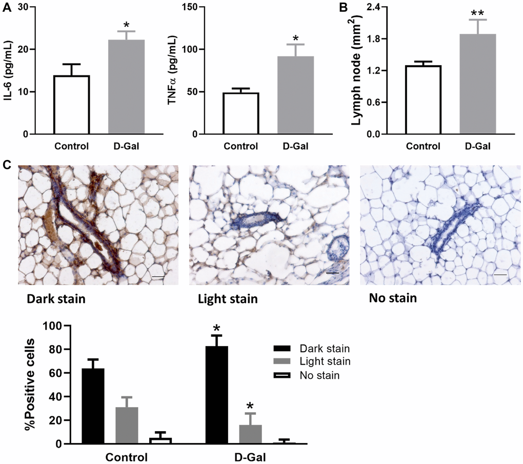 The mice treated with D-galactose exhibited significantly higher plasma levels of inflammatory cytokine IL-6 and TNFα than the control group (Figure 1A). Specifically, the levels of IL-6 and TNFα were increased 1.6- and 1.9-fold, respectively. Mammary glands from D-galactose-treated mice had enlarged lymph nodes, which on average increased approximately 1.45-fold when measured by area (Figure 1B). In addition, p-STAT5, a downstream regulator of IL-6 and TNFα, was detected at a higher frequency of dark staining in mammary glands from D-galactose-treated mice (83%) than those from control mice (64%) (Figure 1C). The D-galactose group also demonstrated a significantly lower level of p-STAT5 light staining than the control (16% vs. 31%) (Figure 1C).