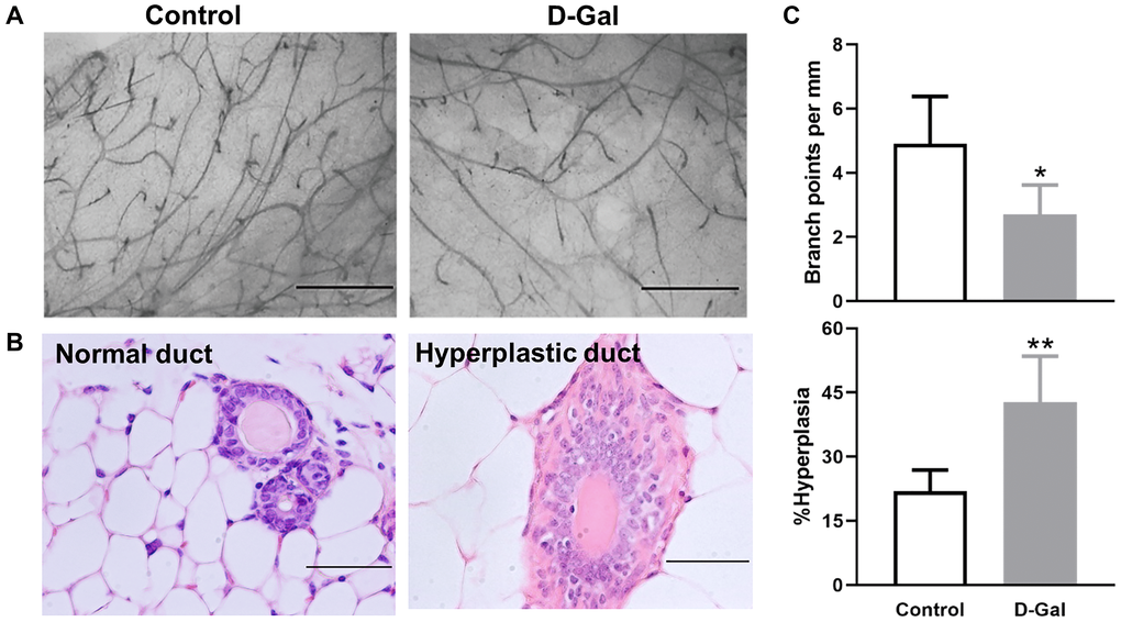 Mice treated with D-galactose showed altered mammary glands that were characterized by decreased branching points and higher frequency of hyperplastic mammary ducts (Figure 2). The branching points per millimeter (mm) mammary duct were decreased, with 4.9 ± 1.5 in control mice and 2.7 ± 0.9 in D-galactose-treated mice (P < 0.05) (Figure 2A, 2C). The frequency of hyperplastic duct increased from 21.9 ± 4.9% in control mice to 42.8 ± 10.1% in D-galactose-treated mice (P < .01) (Figure 2B, 2C).