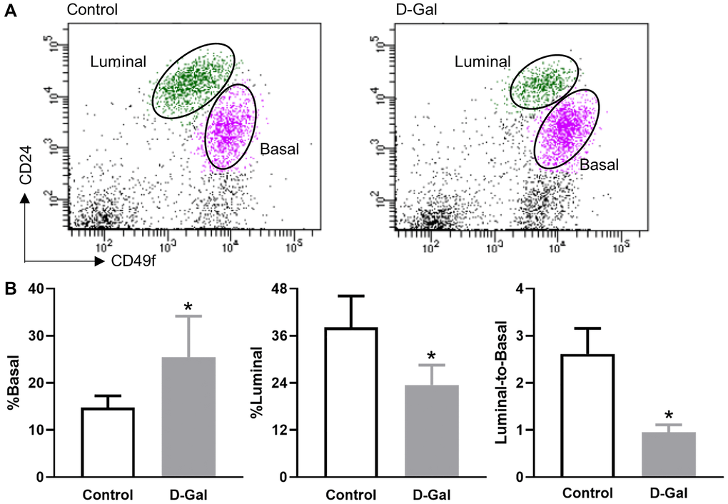 Mammary epithelial cells are composed of basal and luminal cells. Flow cytometry analysis revealed increased basal cells (CD24lowCD49high) and decreased luminal cells (CD24highCD49low) in mammary glands harvested from D-galactose-treated mice when compared to control mice (Figure 3A). Quantitative analysis showed that the frequency of basal cells increased from 14.8 ± 2.4% in the control mice to 25.5 ± 8.7% in the D-galactose-treated mice (Figure 3B). In contrast, the frequency of luminal cells decreased from 38.2 ± 7.9% in control mice to 23.5 ± 5.1% in D-galactose-treated mice (Figure 3B). As a consequence, the luminal-to-basal cell ratio decreased from 2.6 ± 0.5 in control mice to 1.0 ± 0.2 in D-galactose-treated mice (Figure 3B).