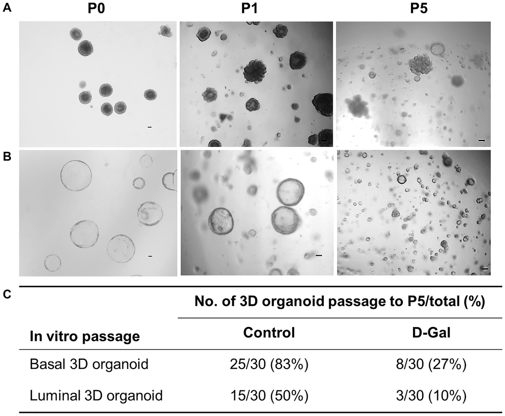 Stem cell self-renewal and differentiation in vivo was assessed by the cleared fat pad transplant assay as described previously [13]. In brief, 3D organoids from control and D-galactose-treated GFP C57BL/6 mice were injected into the contralateral inguinal glands of 21-day-old virgin wild-type female C57BL/6 mice cleared of endogenous epithelium. For basal stem cells, one single solid 3D organoid was injected into one cleared fat pad (CFP). For luminal progenitor cells, five hollow 3D organoids were injected into one CFP. A total of six CFPs were used for each type of 3D organoid per treatment group. Outgrowths, defined as epithelial structures with both ductal and lobular structures, were evaluated by Nikon fluorescence microscope after eight to ten weeks. The regenerated glands were further harvested for flow cytometry analysis of the luminal-to-basal cell ratio as well as histopathological analysis for hyperplastic lesions.