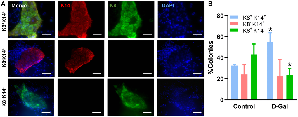 We also characterized LP differentiation in vitro using the 2D colony forming assay, where LPs were found to form morphologically distinct colonies when cultured on plates pre-seeded with irradiated NIH-3T3 fibroblasts (Figure 5A). Colonies formed by LPs from D-galactose-treated mice were dominated by K8+K14+ bipotent colonies (55 ± 9%), while those from control mice were dominated by K8+K14– colonies (43 ± 10%) (Figure 5B). In fact, there was a significant reduction of K8+K14– colonies (24 ± 6%) in D-galactose-treated mice. The percentage of colonies displaying K8–K14+ was similar between control (24 ± 10%) and D-galactose-treated mice (23 ± 16%) (Figure 5B). MaSC differentiation was not assessed in vitro because they cannot form colonies in this assay.